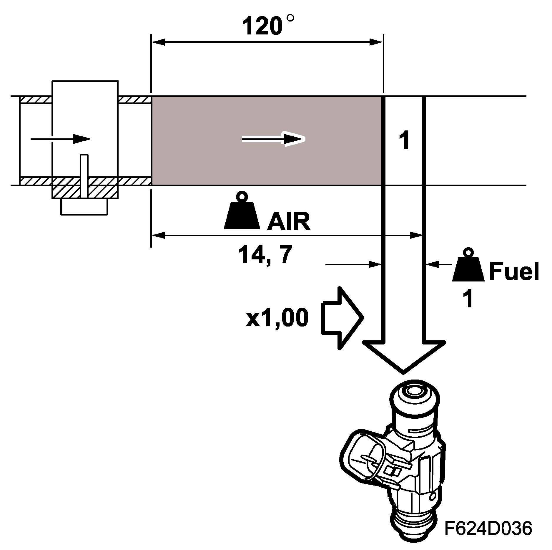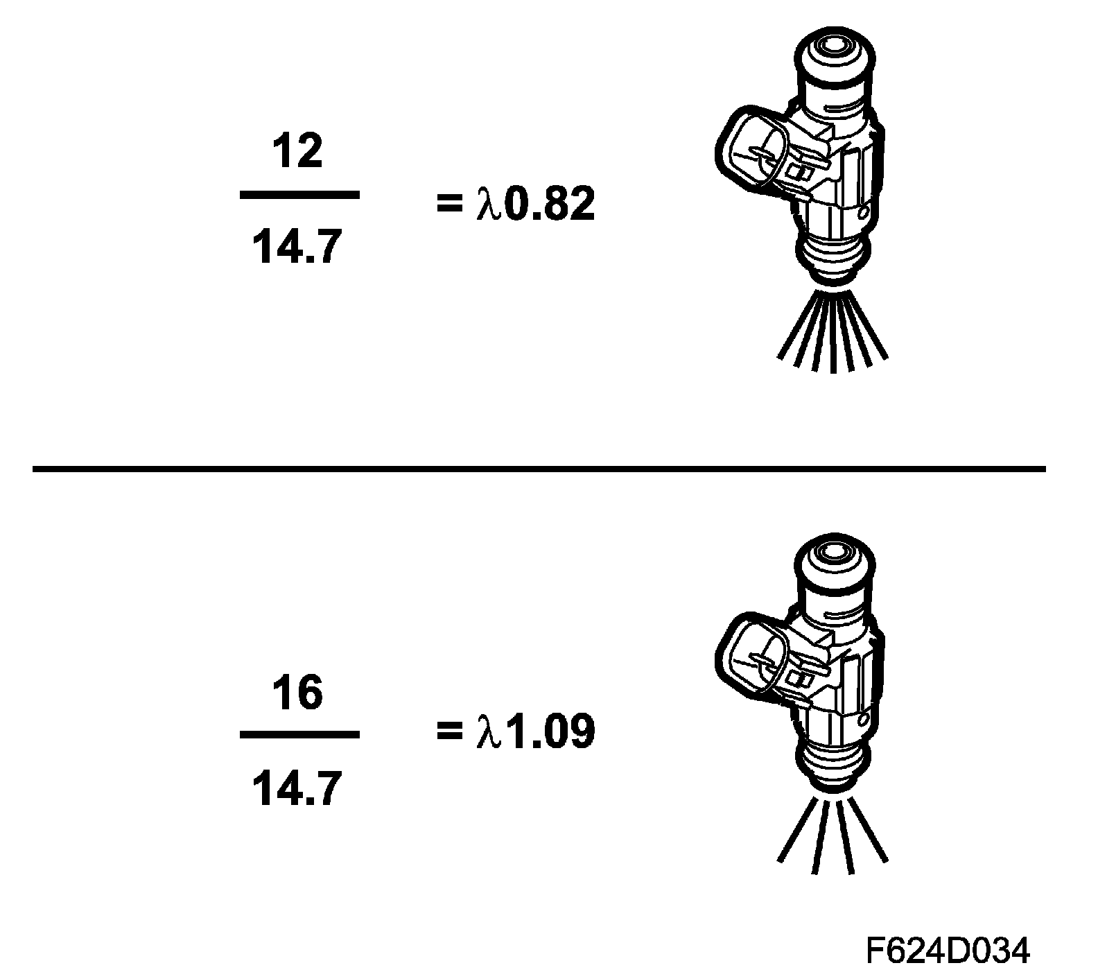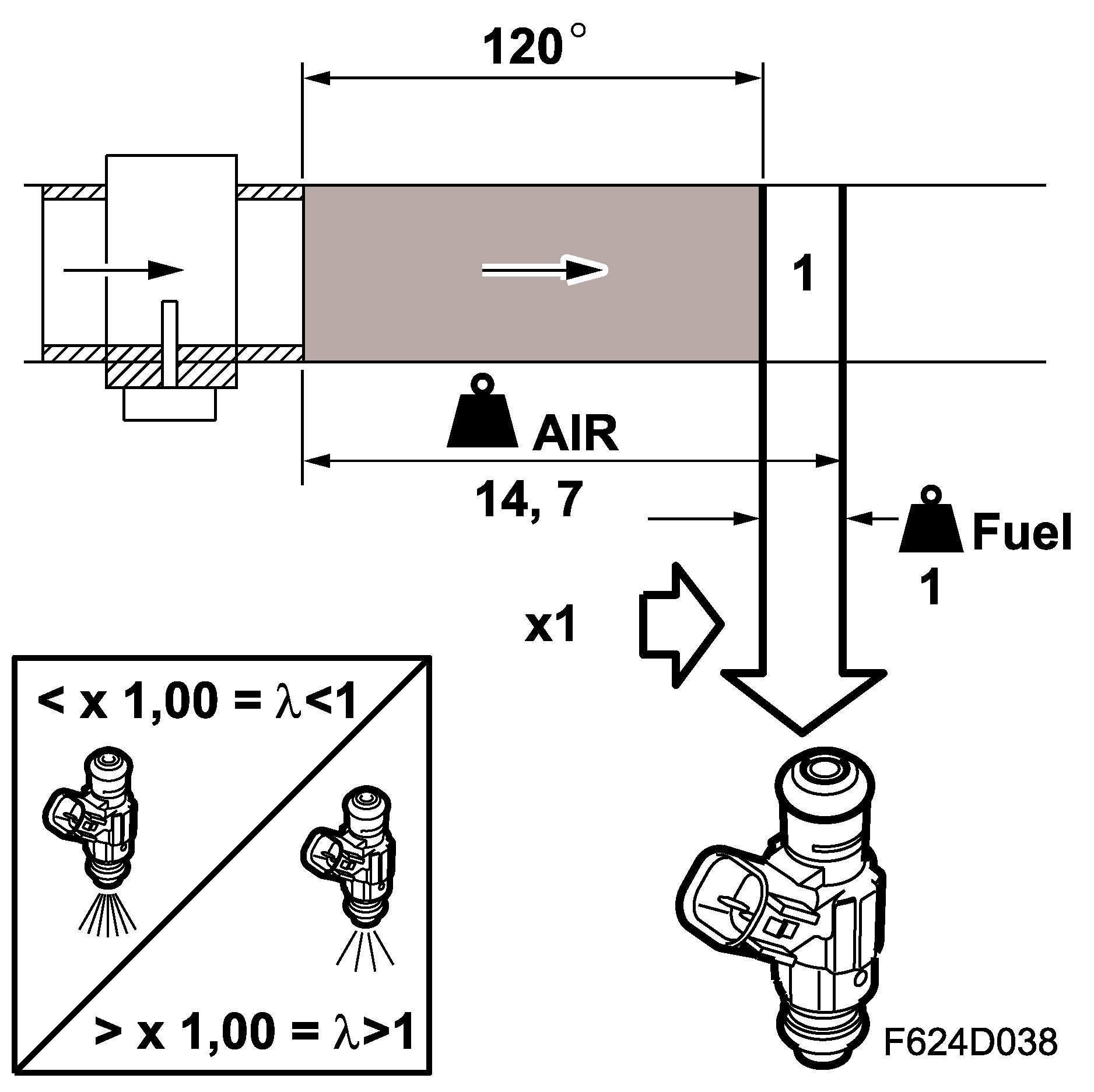 To achieve lambda = 1, there must be a specific fuel/air ratio, namely 1 kg fuel to 14.7 kg air. As we know how much air has been drawn into each cylinder per combustion, the control module can easily calculate how much fuel is to be injected into the cylinders each time. The milligrams air/combustion is divided by 14.7 and the result is the number of mg fuel/combustion to be injected into the cylinder.