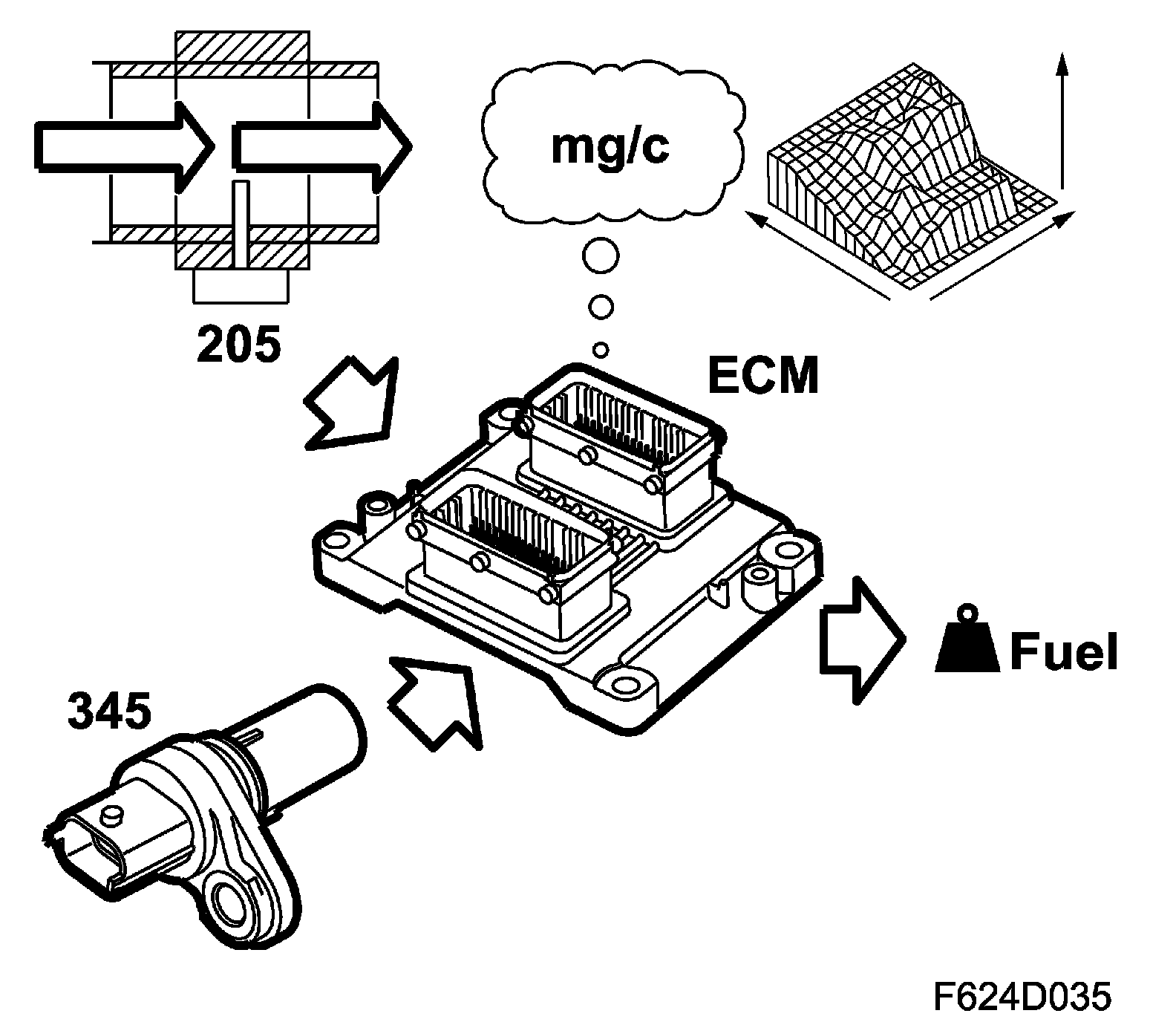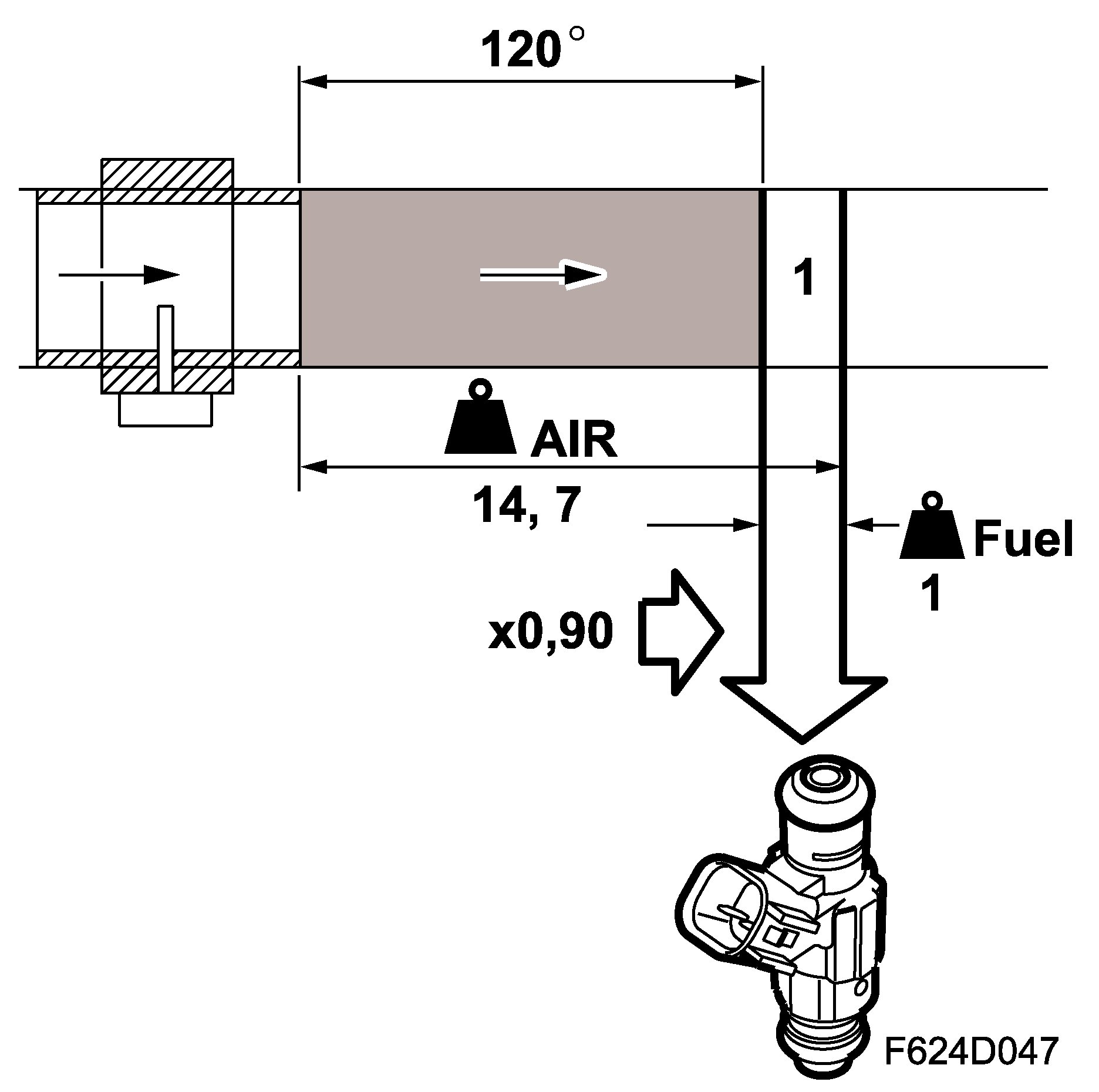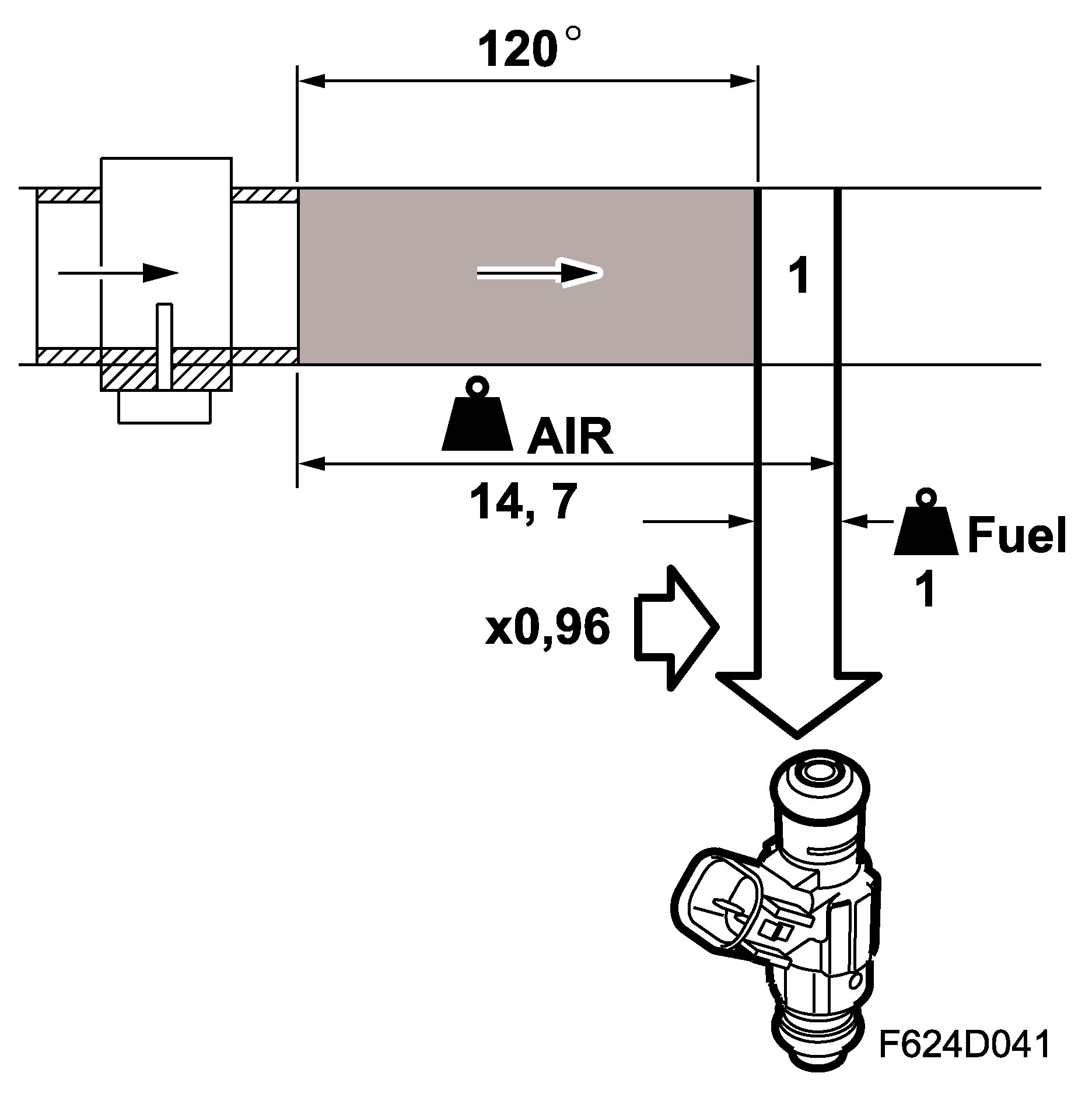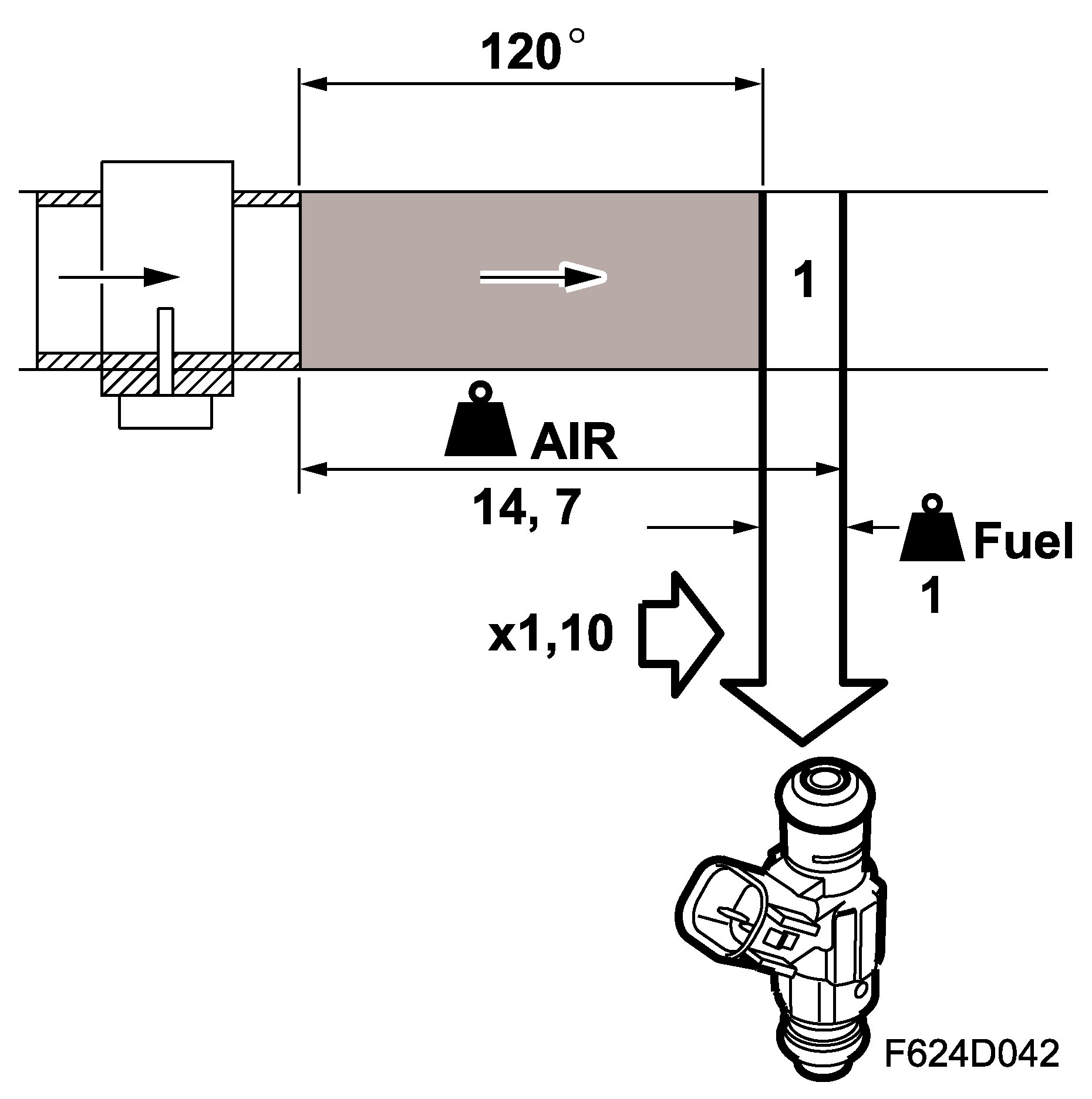 To achieve lambda = 1, there must be a specific fuel/air ratio, namely 1 kg fuel to 14.7 kg air. As we know how much air has been drawn into each cylinder per combustion, the control module can easily calculate how much fuel is to be injected into the cylinders each time. The milligrams air/combustion is divided by 14.7 and the result is the number of mg fuel/combustion to be injected into the cylinder.