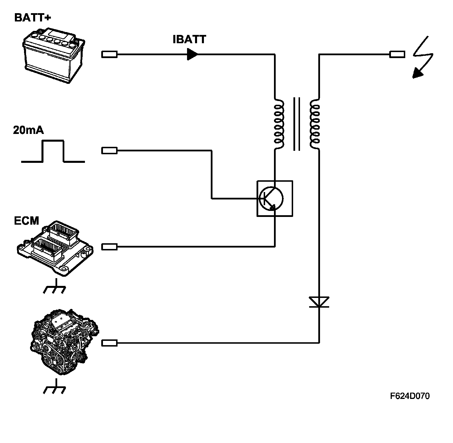 When the main relay is pulled, B+ is supplied to pin 2 of the ignition coils. When ECM supplies pin 1 of the respective ignition coil a pulse of 20 mA, a power transistor integrated in the ignition coil closes the primary circuit. The primary winding consists of relatively few copper wire coils. A magnetic field gradually builds in the ignition coil. When the spare is to be fired, ECM stops supply B+ to pin 1 and induces (builds up) a high voltage across the ignition coil's secondary winding.