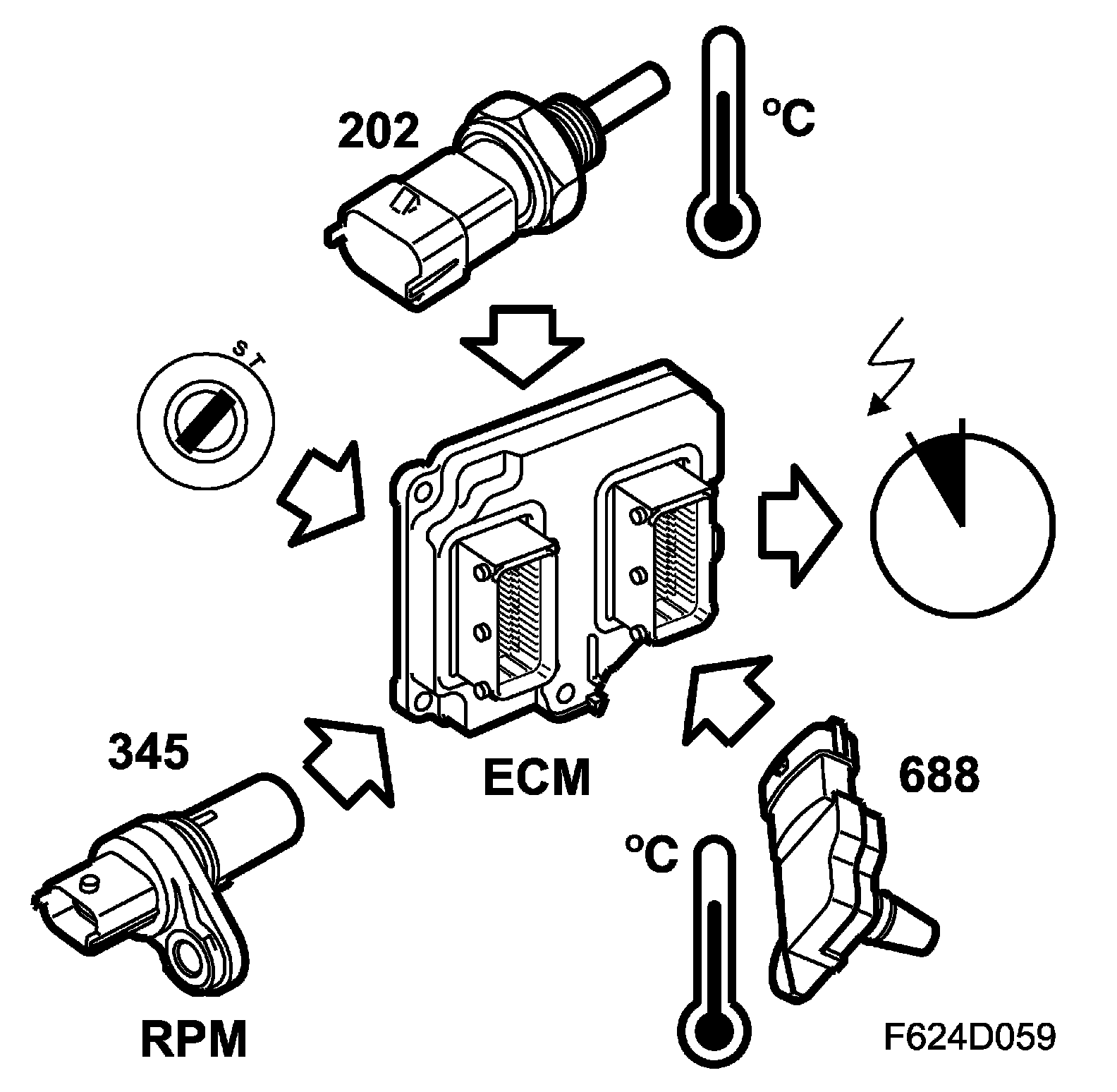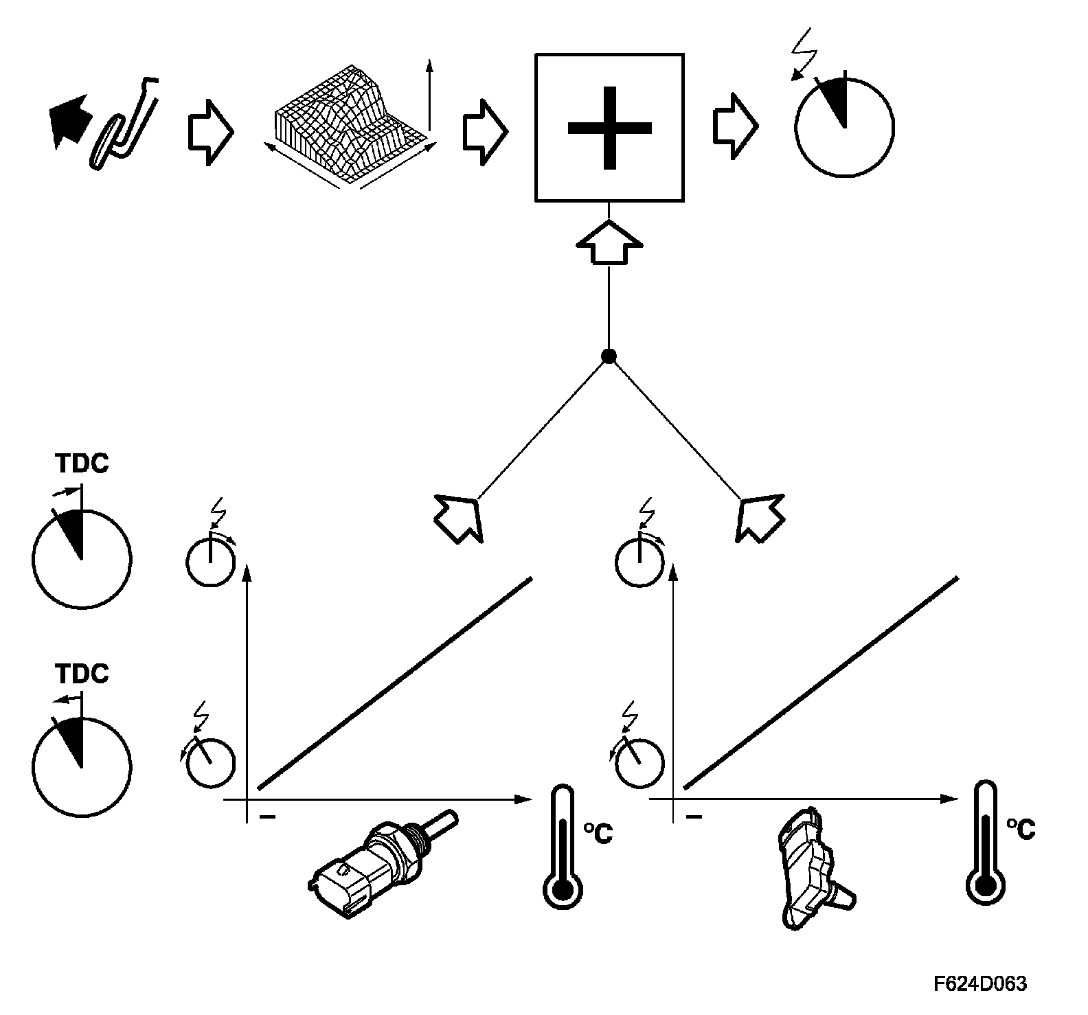 To compensate the differences in the expansion rate of the flame, ignition timing when starting must vary depending on the engine coolant temperature. At low temperatures, the flame will expand slowly in the combustion chamber. In order for the pressure in the cylinder to reach its maximum value at the correct crankshaft position, ignition timing must consequently be relatively advanced when the coolant temperature is low.