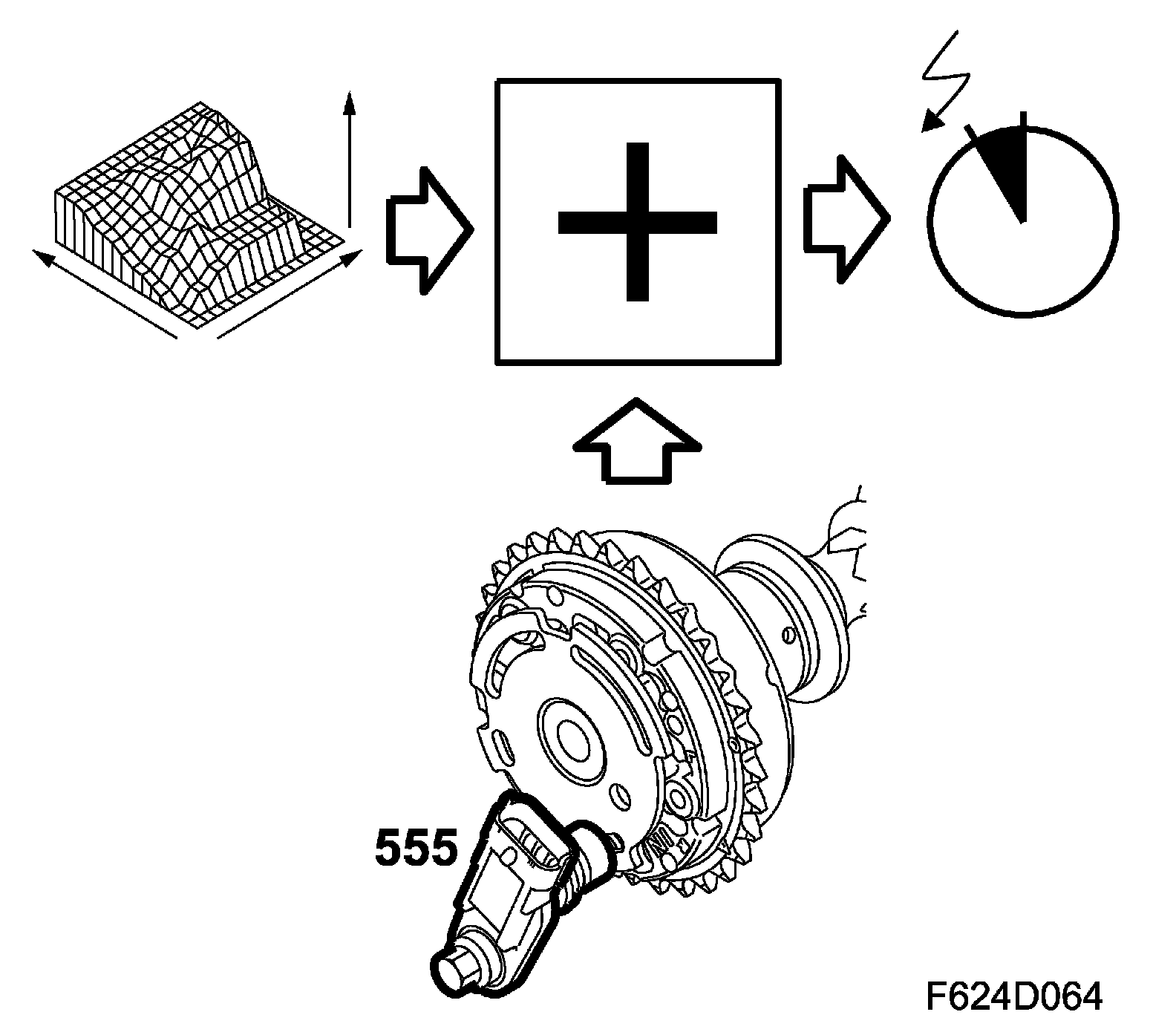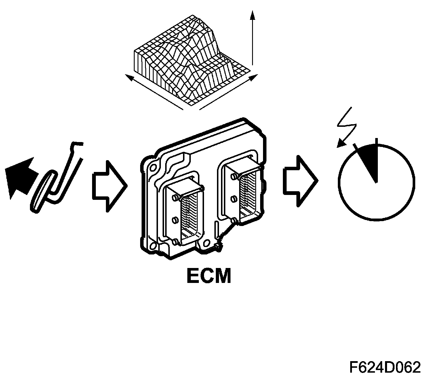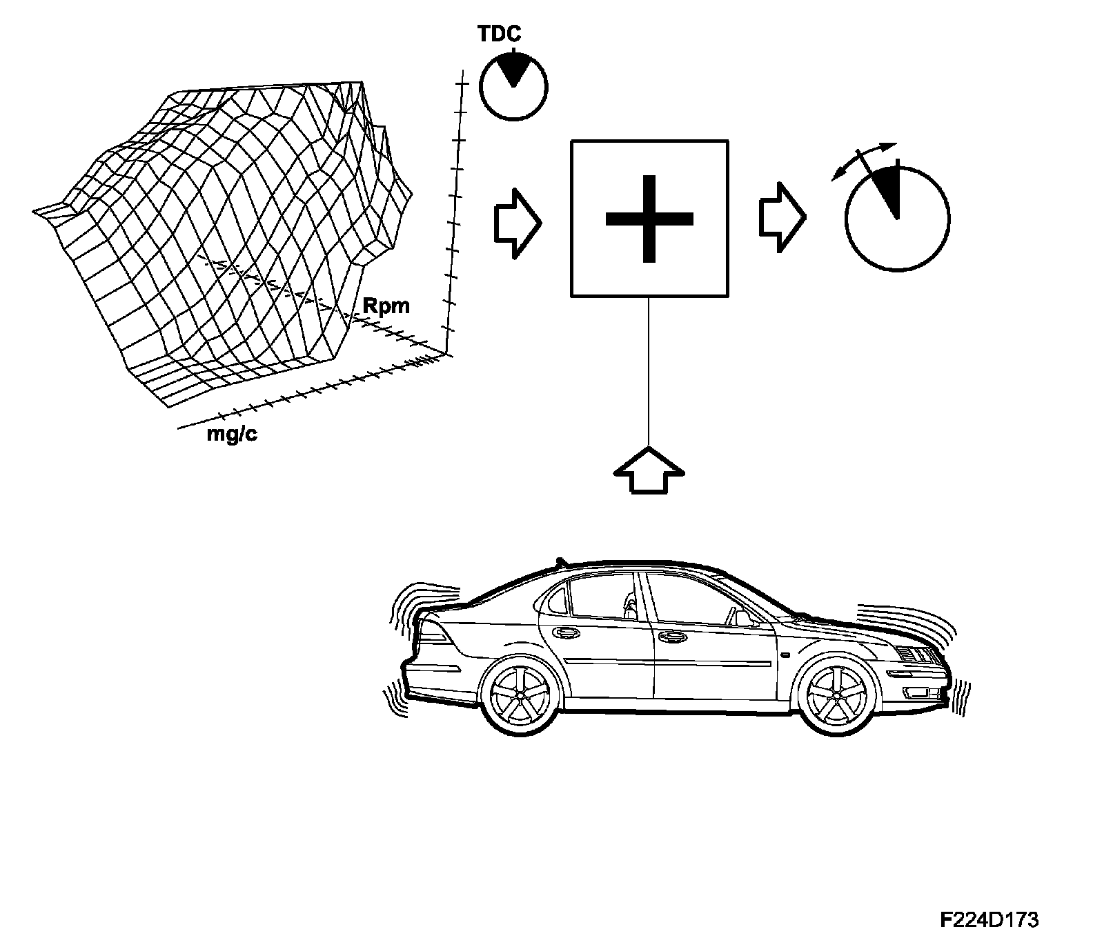 The ignition timing applicable at idling speed is determined mainly by the engine load/speed. But this can be compensated by the effect of various parameters. The idling speed ignition timing function is active during idling. (Accelerator pedal released).