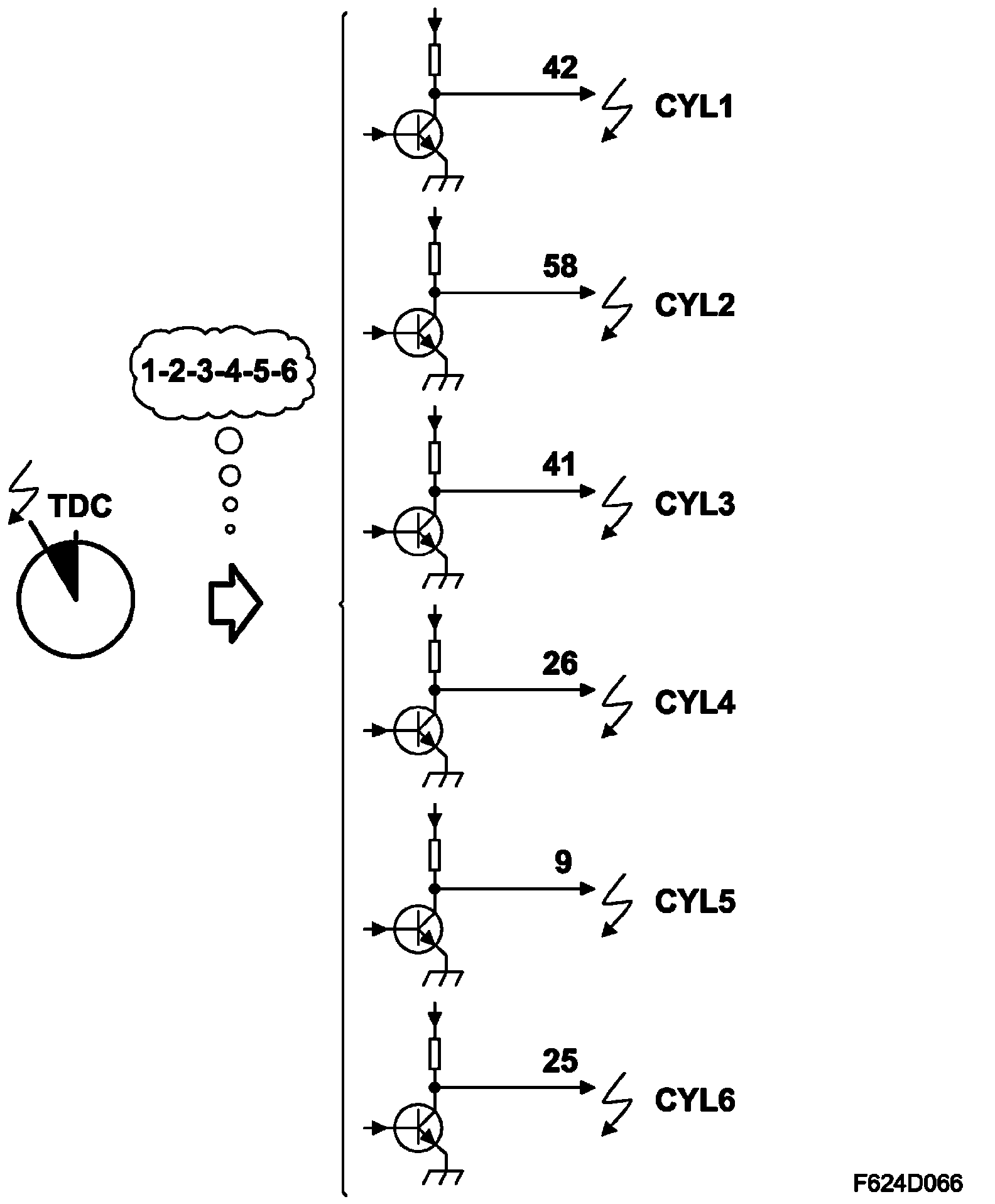 Depending on whether ignition works in start, idling or normal mode, after all compensation the value will be converted to a signal that regulates the power amplifiers of the ignition coils for the six cylinders.