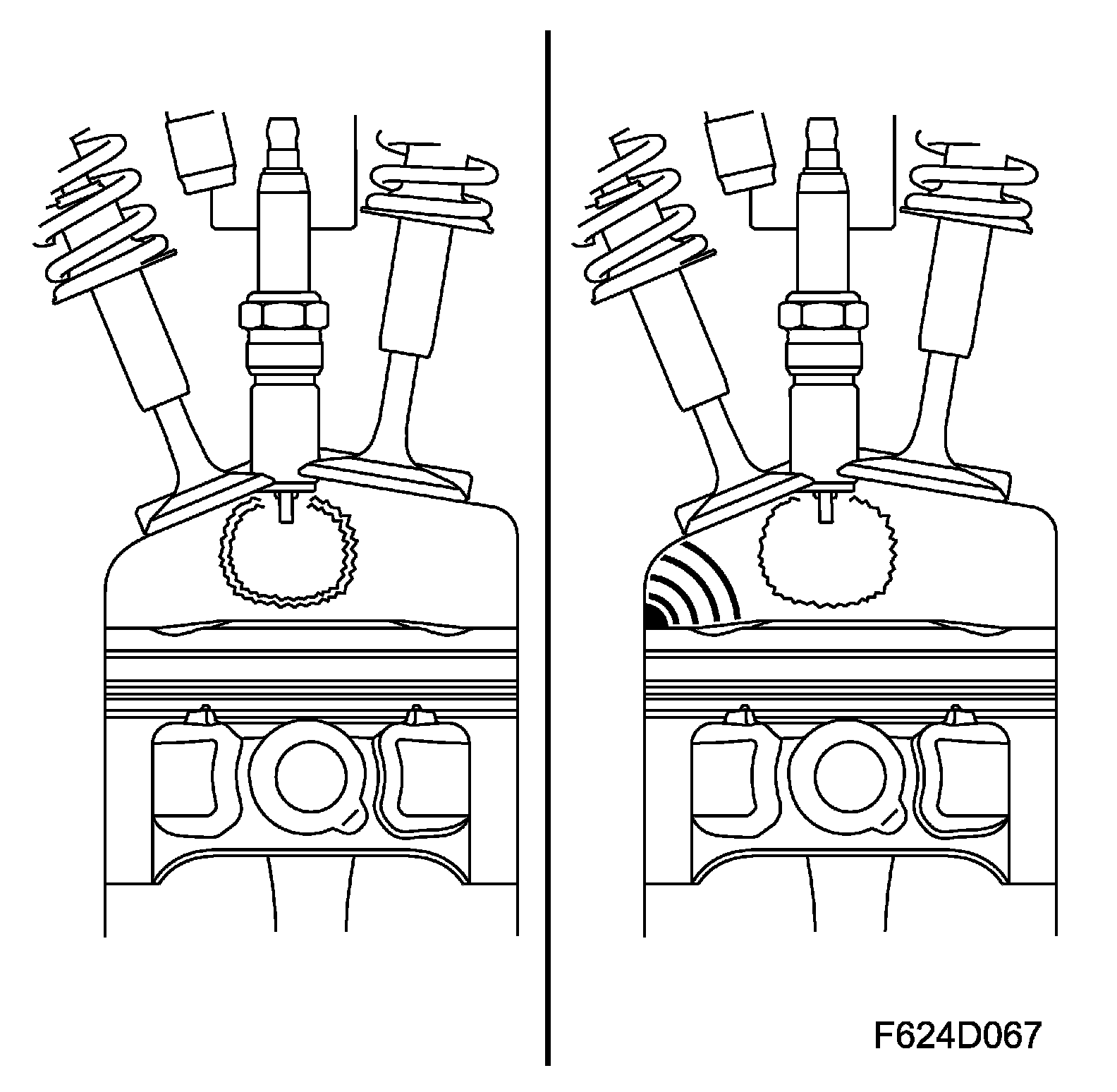During normal combustion, the air/fuel mixture is ignited by the spark form a spark plug. The flame expands in the combustion chamber originating from the centrally located spark plug.