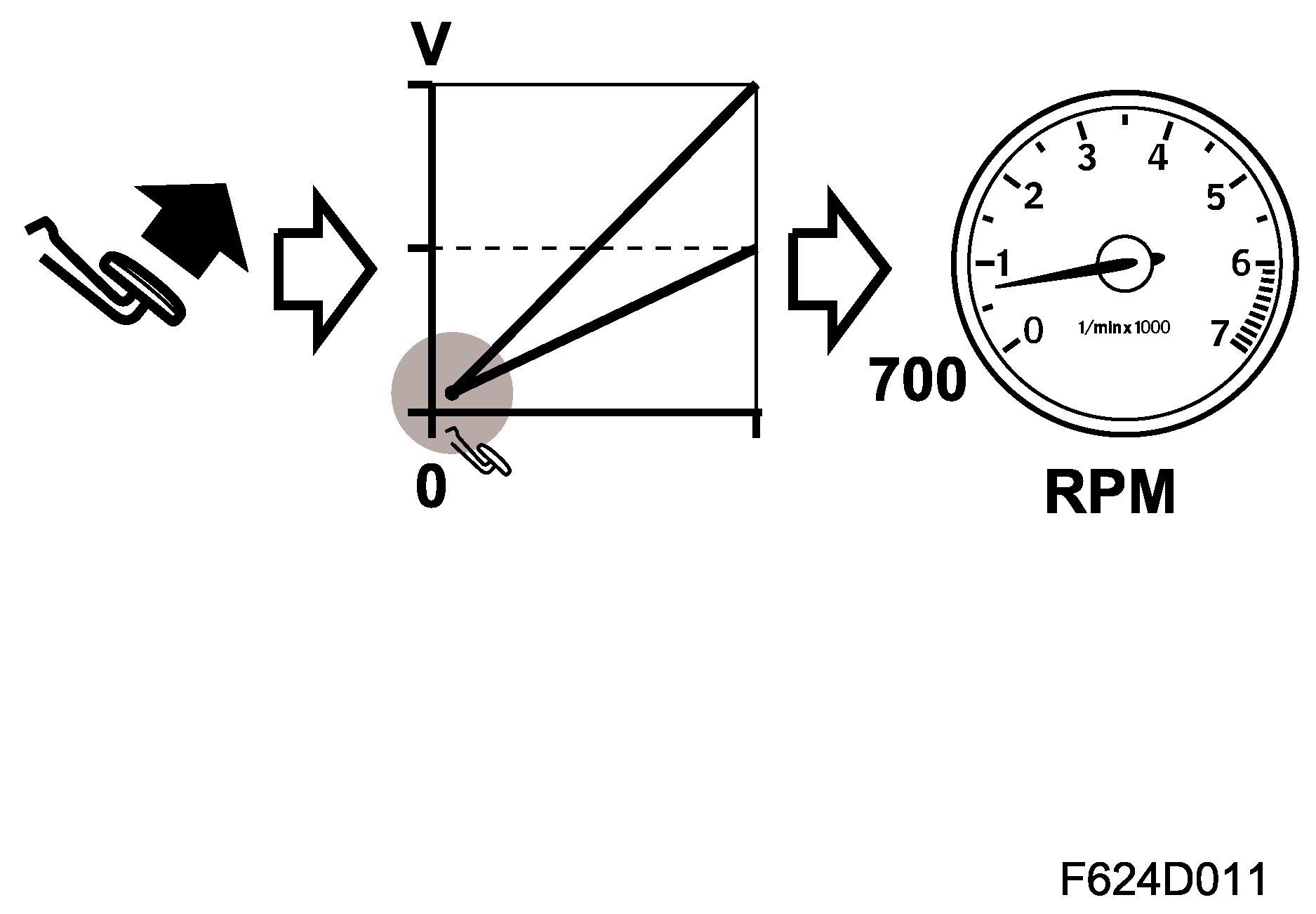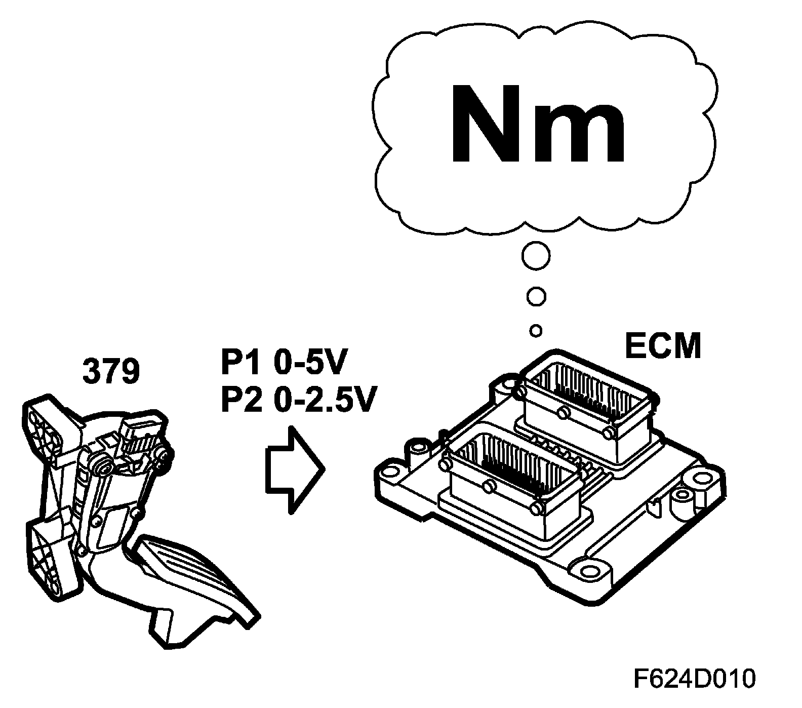 Two potentiometers are integrated in the accelerator pedal bracket. Potentiometer 1 provides ECM with information on the driver's torque request in the form of a voltage signal 0-5 V.