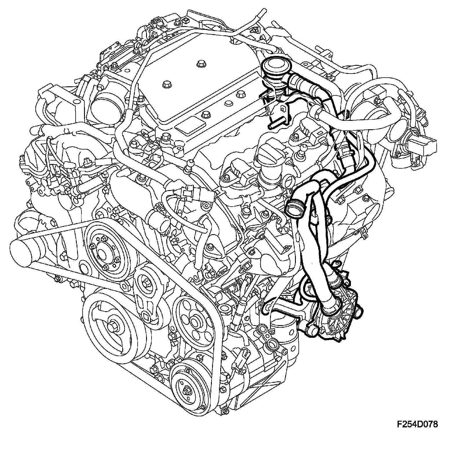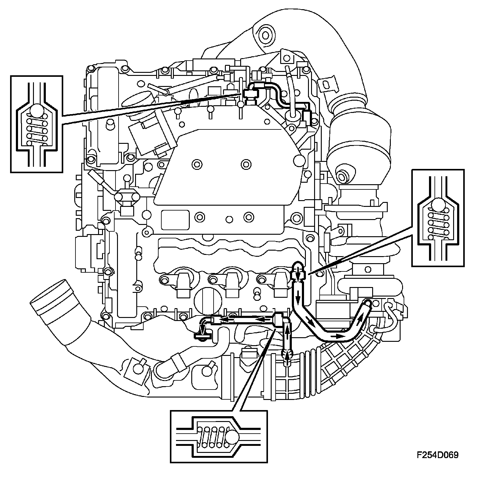 When driving with a high engine load, crankcase gases exit via the front camshaft cover. The gases are led into the turbocharger intake.