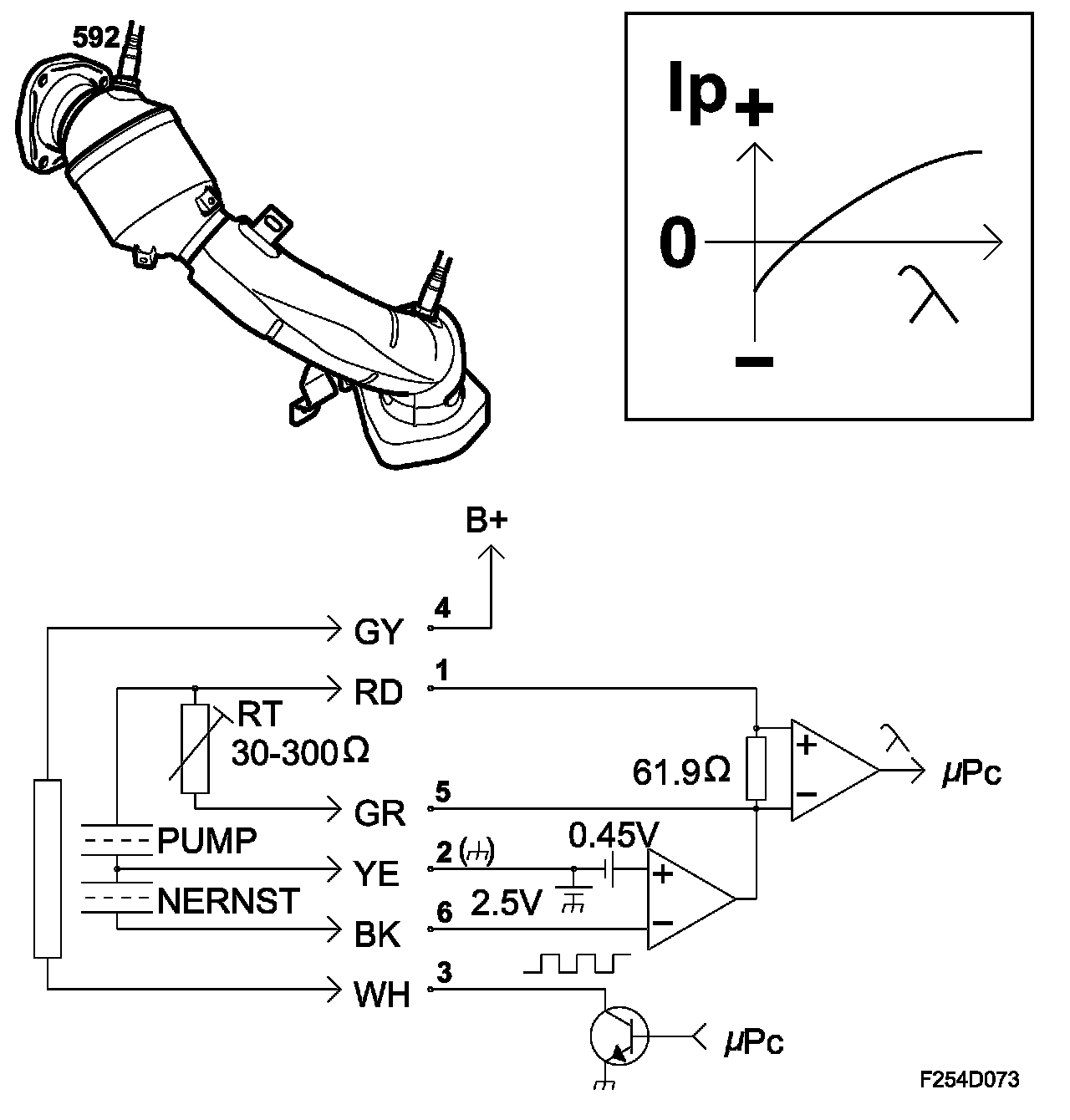 ECM controls the pump current so that the exhaust lambda in the space is always lambda = 1. Once lambda = 1 has been attained, the voltage from the measuring cell will be 450 mV, a voltage that ECM consequently tries to keep constant by varying the pump current. It is therefore the pump current that provides information on the lambda value.