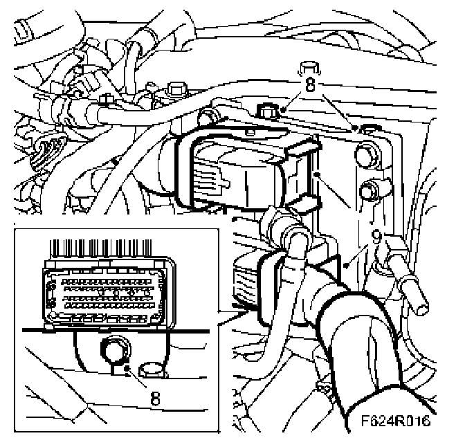 8. Fit the engine control module with mounting. The lower hole of the mounting is slotted.