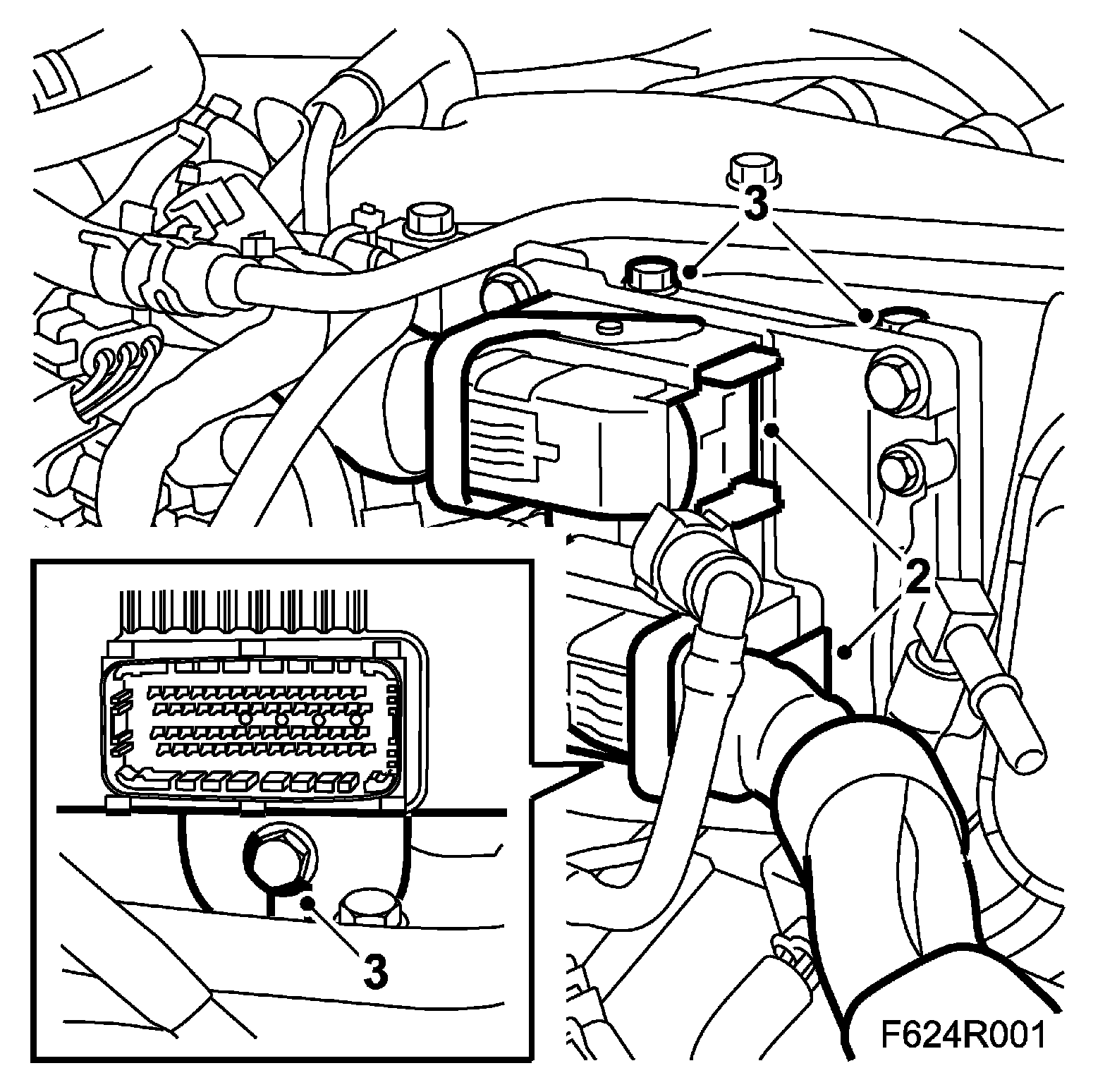 3. Remove the engine control module with mounting. The lower hole of the mounting is slotted.