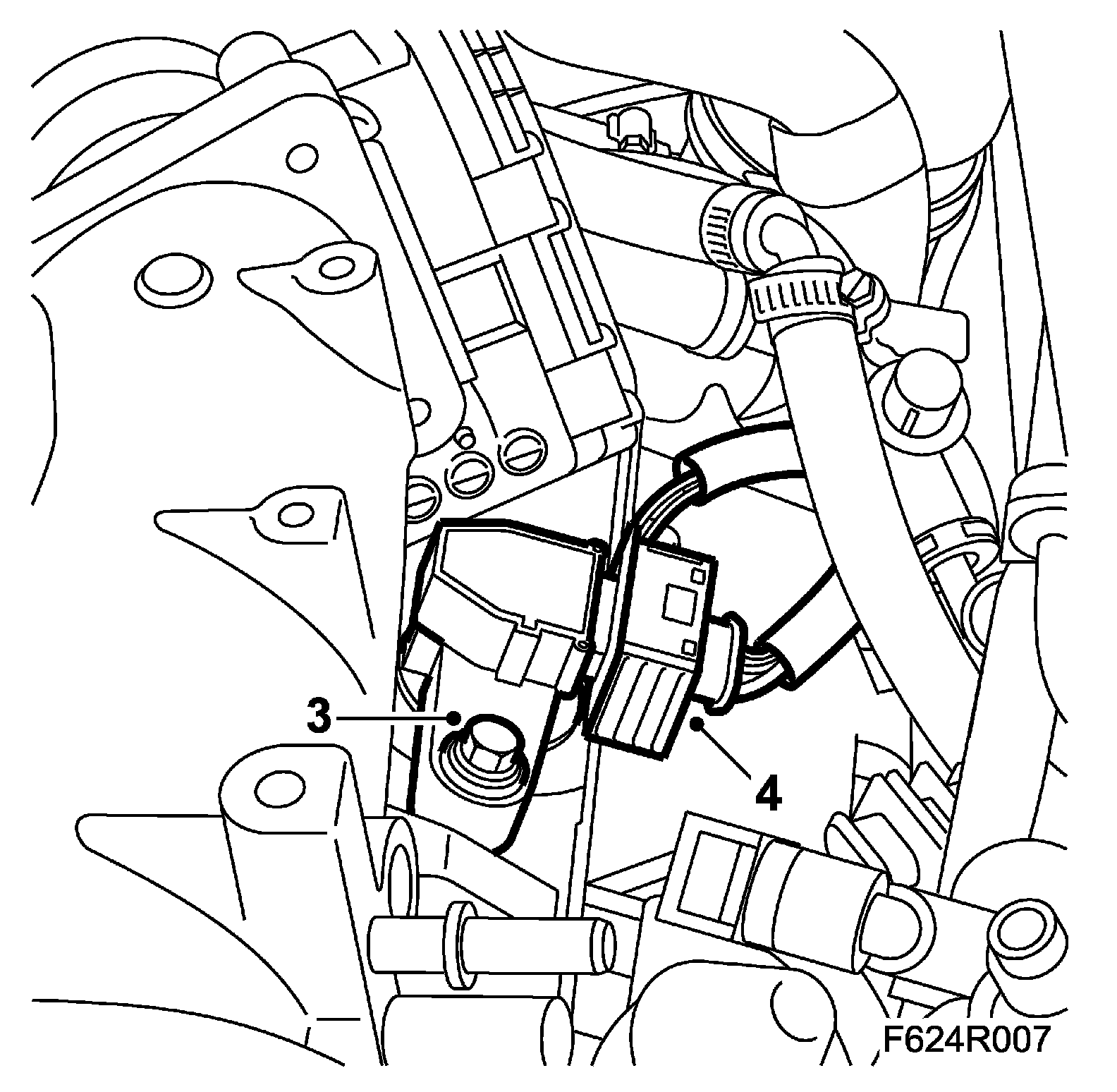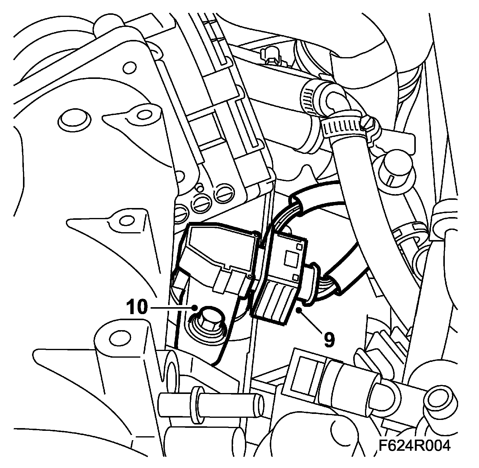 10. Fit the engine control module with mounting. The lower hole of the mounting is slotted.