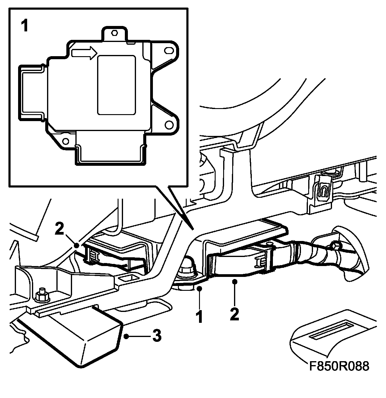 1. Fit the Airbag Control Module by inserting it between the center console's aluminium frame and the floor into its position. Tighten the screws that hold the Airbag Control Module.