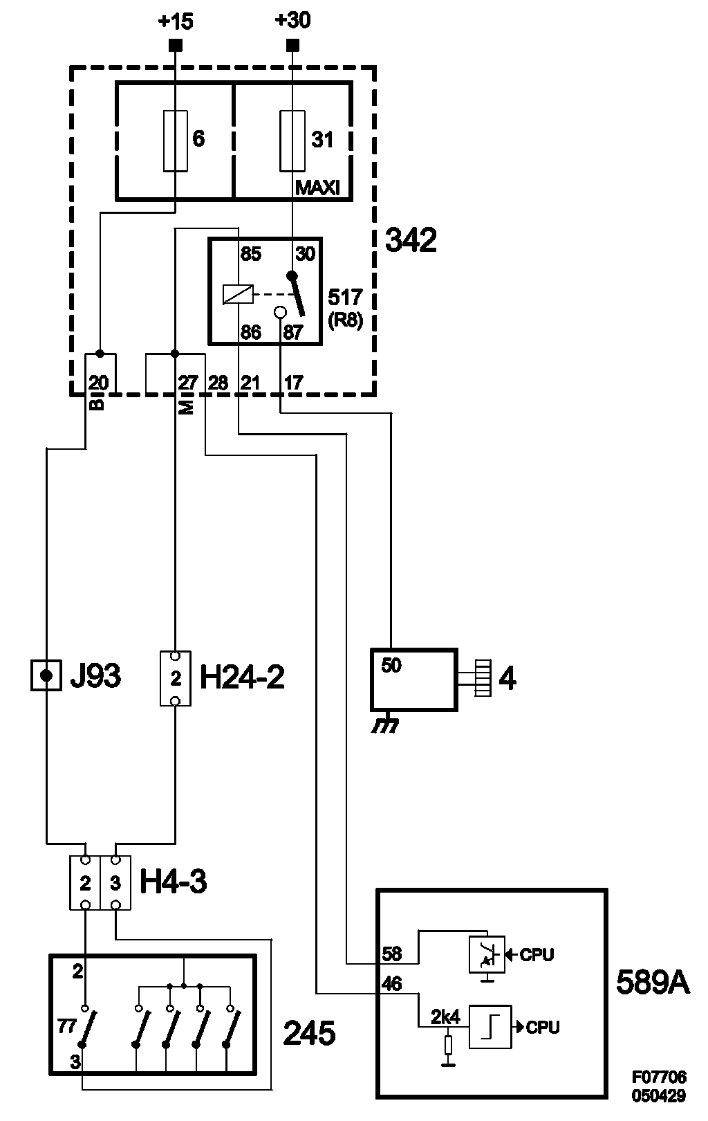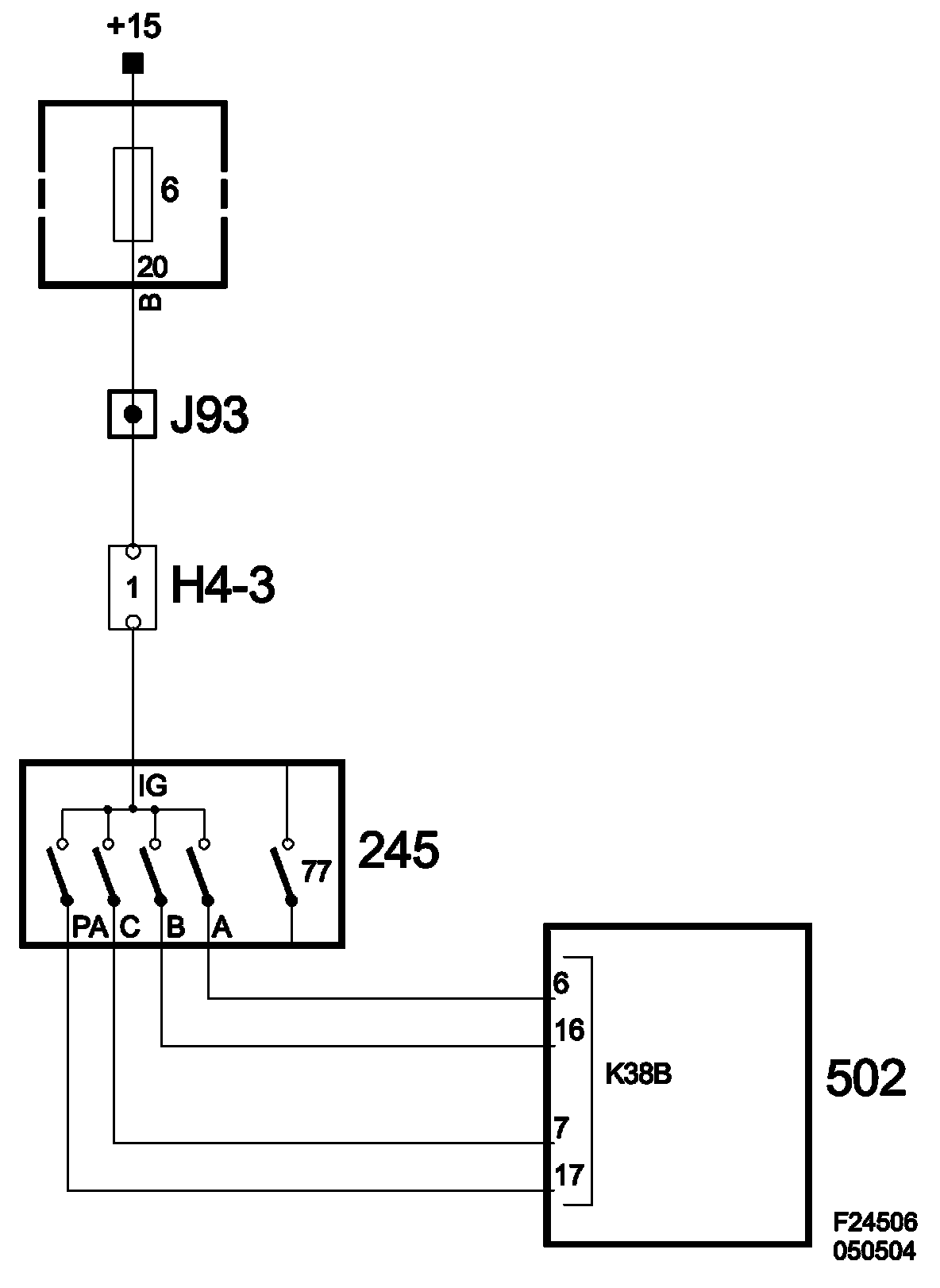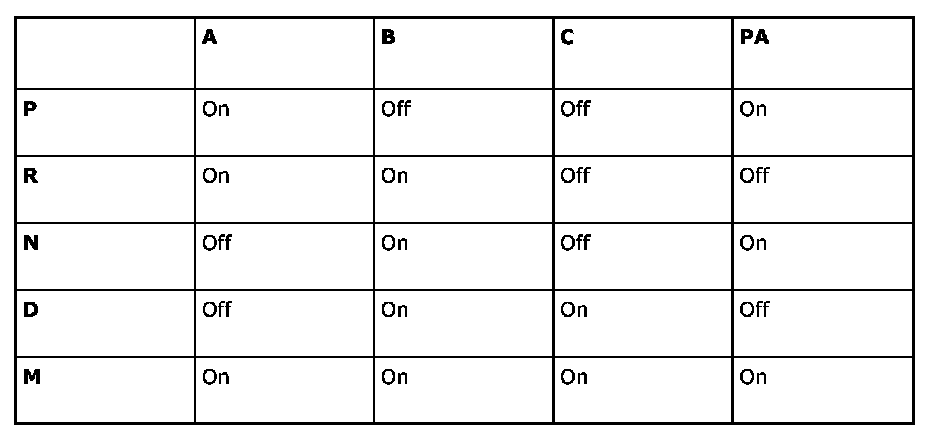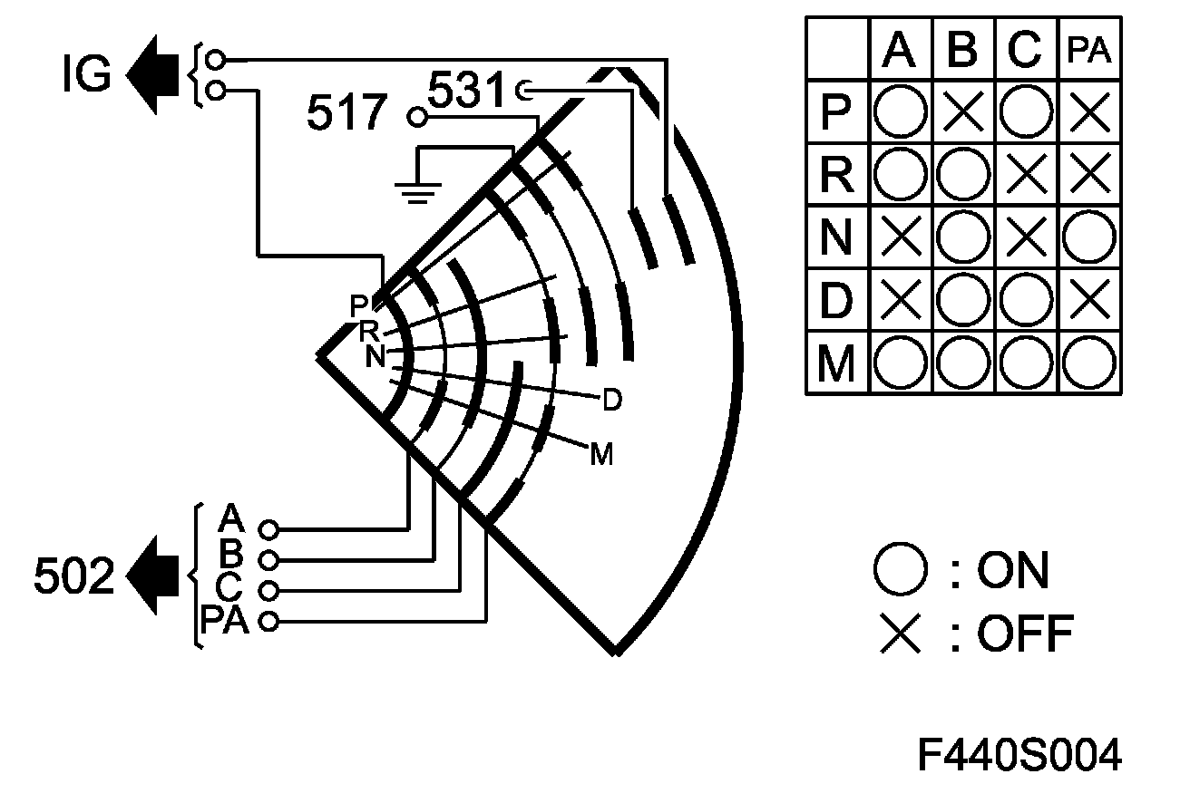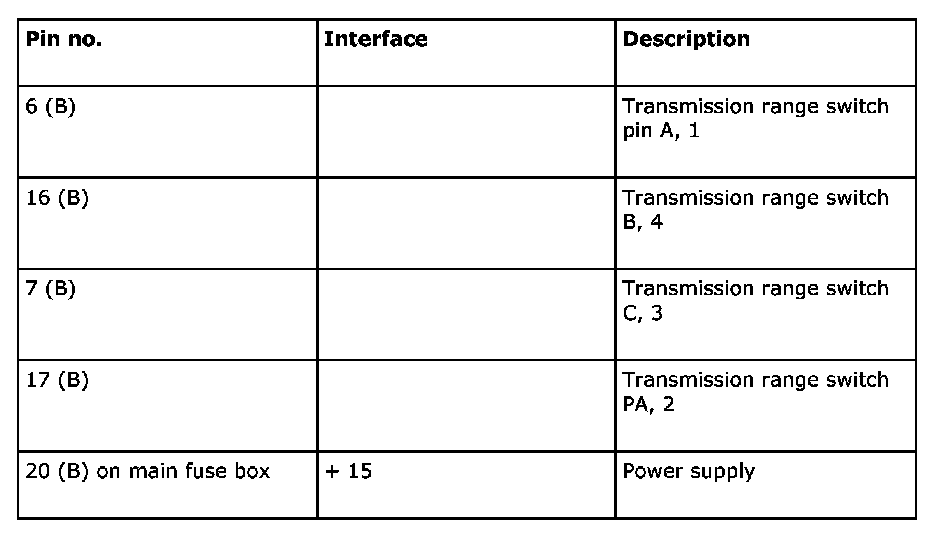 The transmission range switch is a position switch that is powered via +15 from fuse 6 in Rear electric center 342. A number of slip contacts provide the current to the sensor outputs. A combination of terminals A, B, C and PA provide the current selector lever position (see table).The slip contacts can be either closed (ON) or open (OFF).