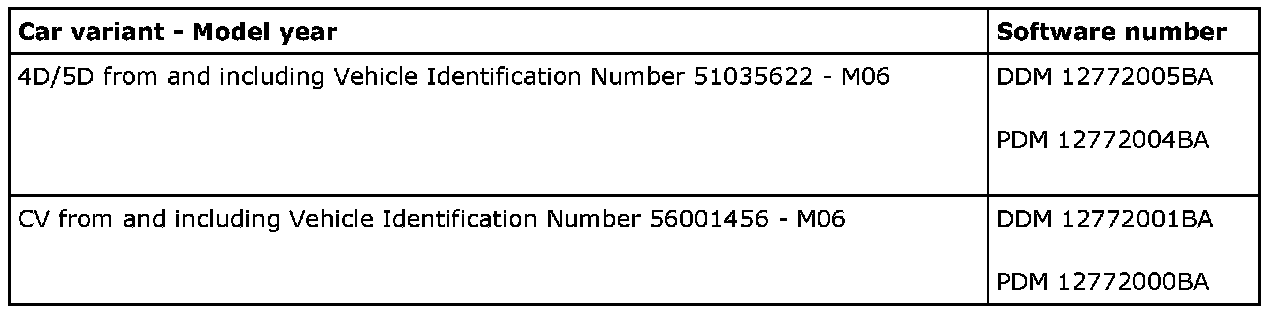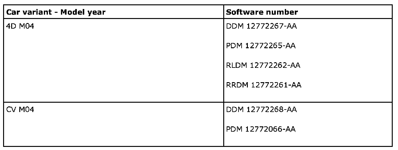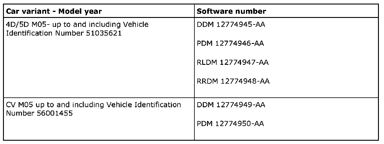 Connect Tech2 (version 126.000 or later) and perform the update. The software is available on IRIS from and including TIS2000 edition 2006-3 update 1. Add the door control module with Tech2 under the menu, All - Add/Remove. Check the function.