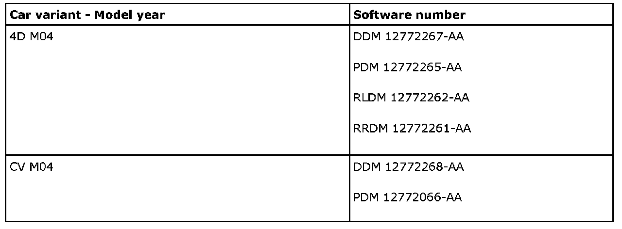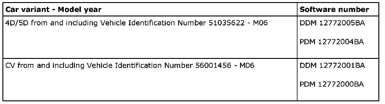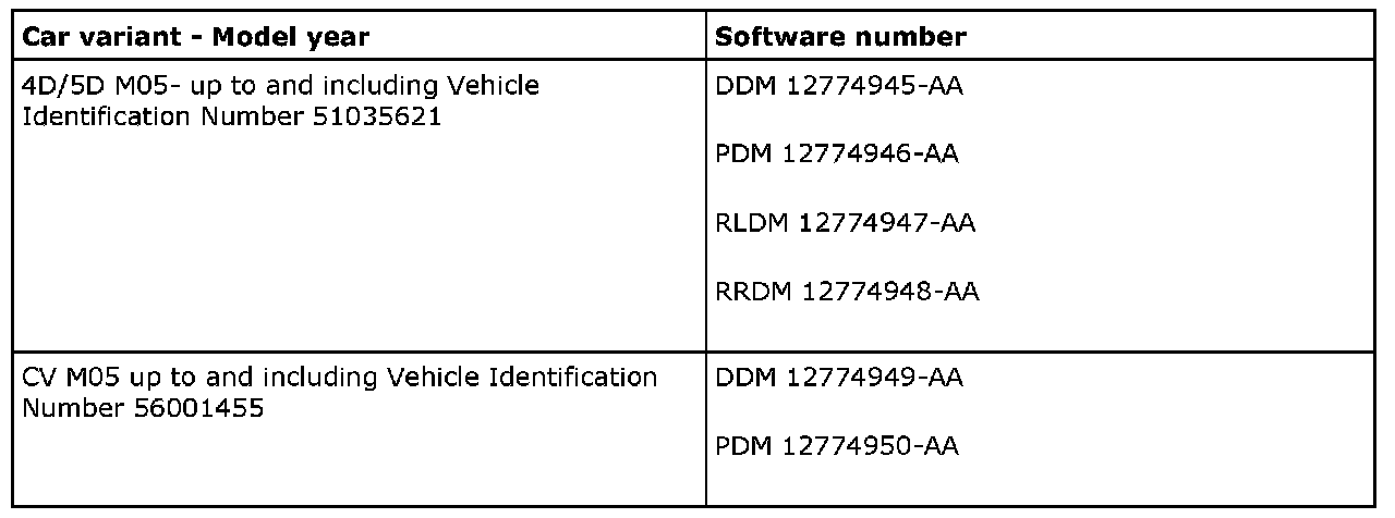 Connect Tech 2 (version 126.000 or later) and perform the update. The software is available on IRIS from and including TIS2000 edition 2006-3 update 1. Add the door control module with Tech 2 under the menu, All - Add/Remove. Check the function.