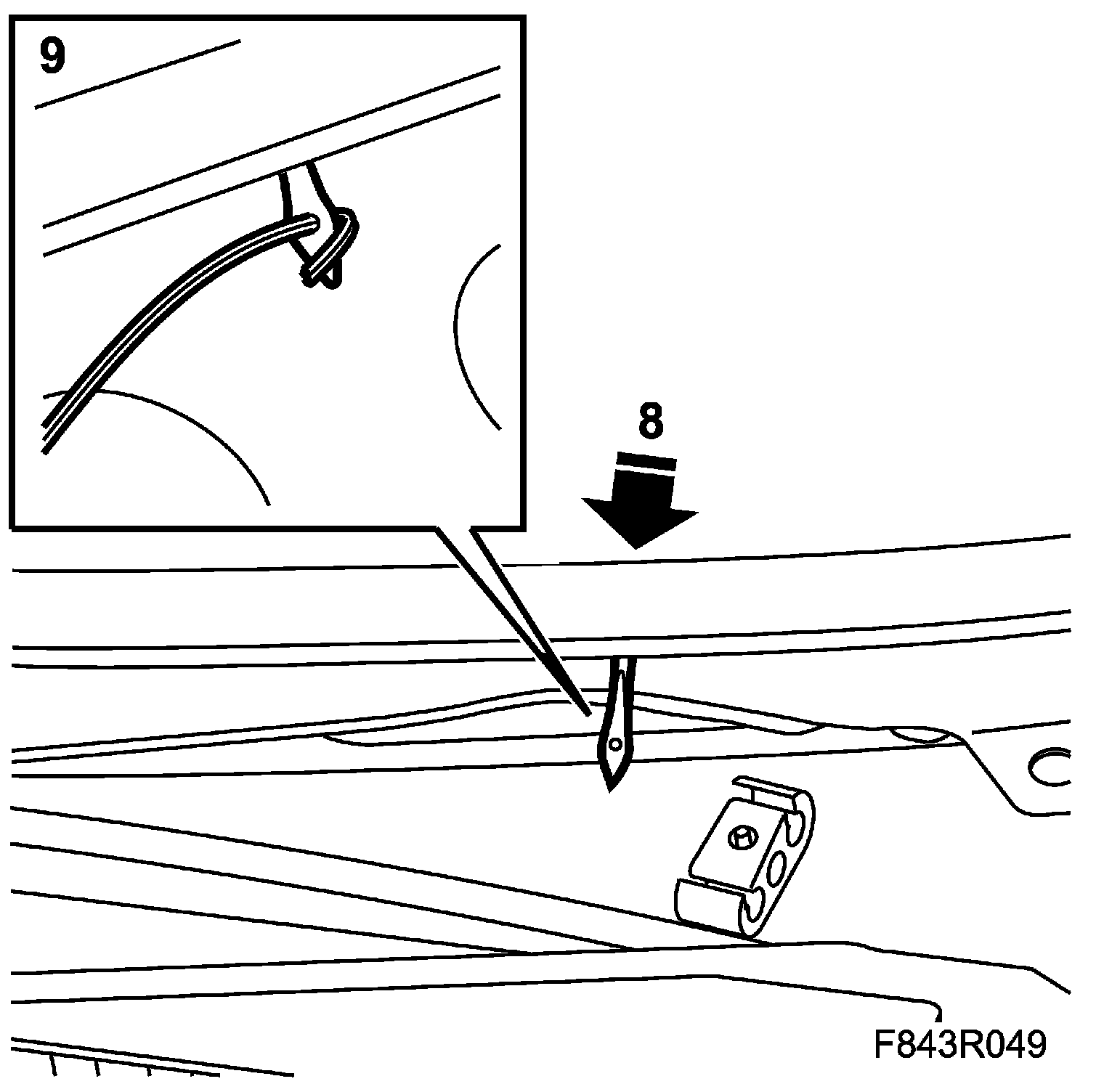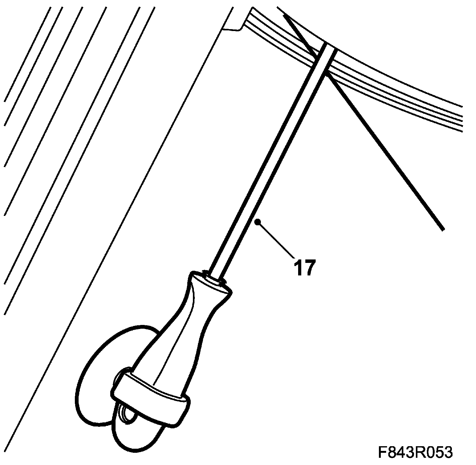 17. When the wire starts to cut along the top edge of the windscreen, fit the protective tool with suction cup between the cutting wire and metal roof so that the wire does not catch on the metal. Move the reel and the protective tool progressively as the window loosens.