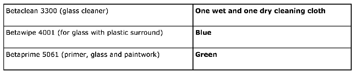 6. Fitting a new window: Tape any antenna connections to the windscreen to avoid the connections ending up in the bead of adhesive. Carefully wash the edges of the window with Betawipe 3300. Carefully wipe the edges using the wet cleaning cloth. Dry with the dry cleaning cloth provided in the adhesive kit. Avoid touching the cleaned surface.