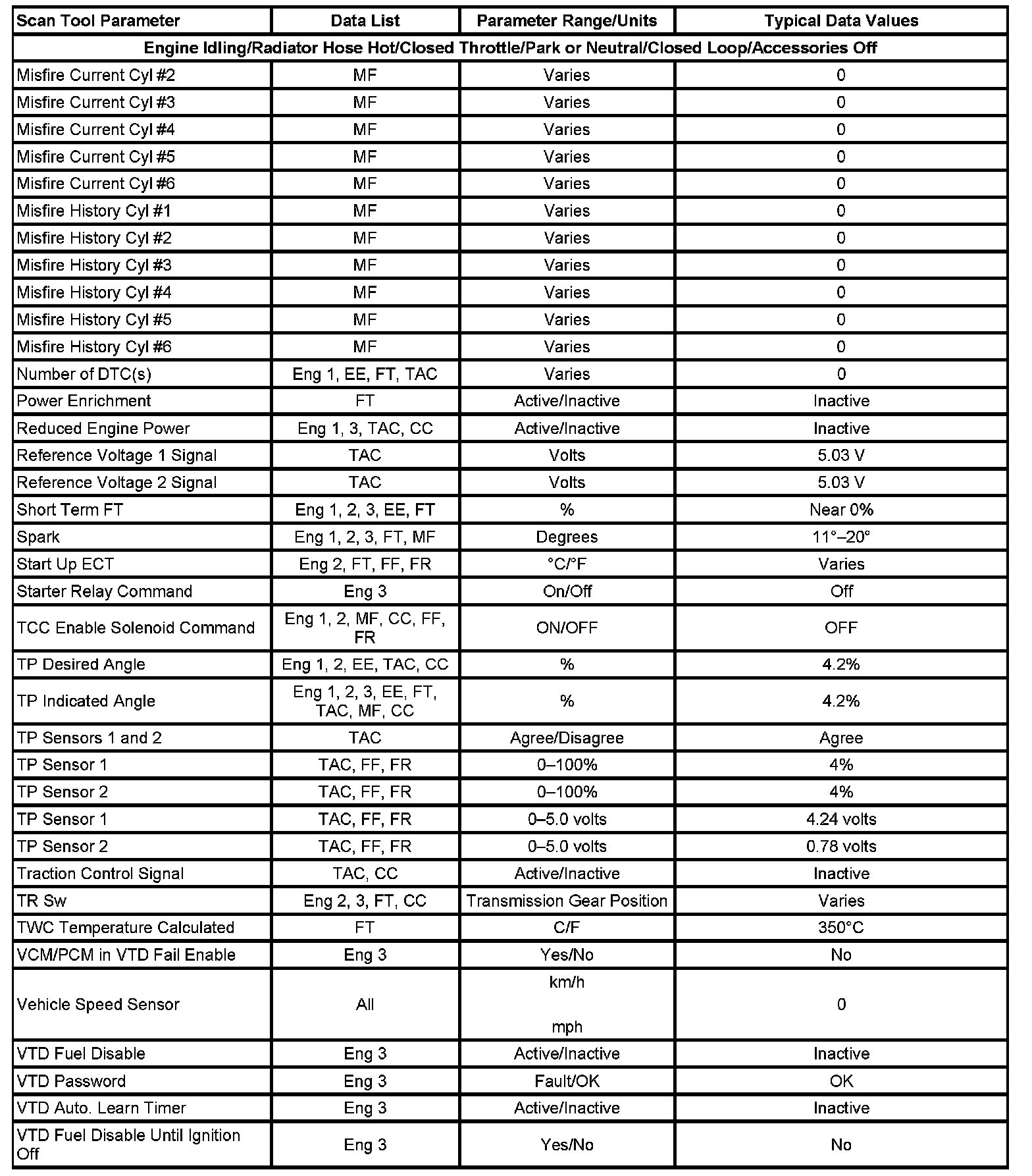 The column labeled Data List indicates where a parameter can be located on the scan tool. Refer to the scan tool operating manual for the exact locations of the data lists. The following is a description of each term listed: