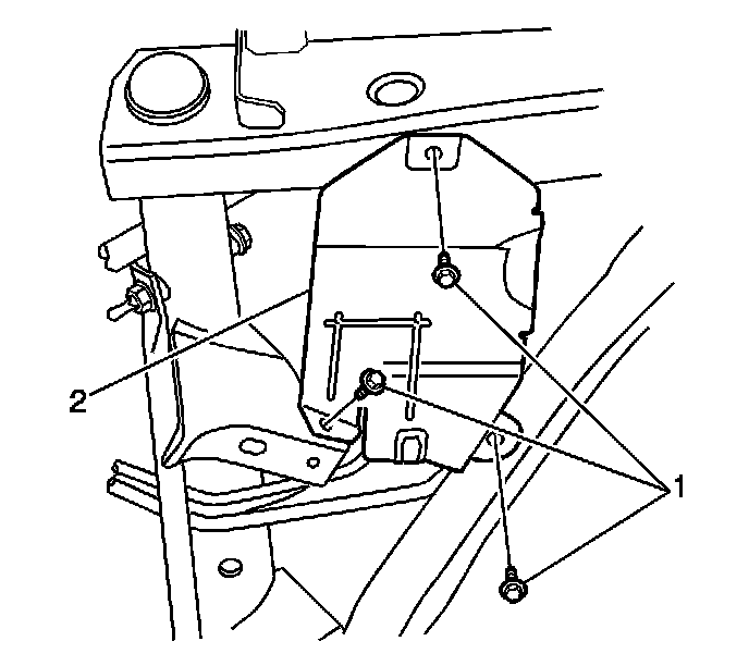 6. Remove the bolts (1) from the EVAP mounting bracket (2).