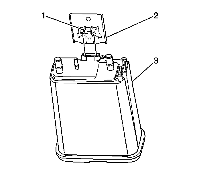 1. Install the EVAP retaining bracket (2) to the EVAP canister (3) ensuring the retaining bracket clip (1) is fully engaged.