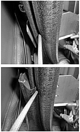 4. Install the window guide clip to the bracket on the side of the channel. The top illustration is without the clip and the bottom illustration shows the clip installed.