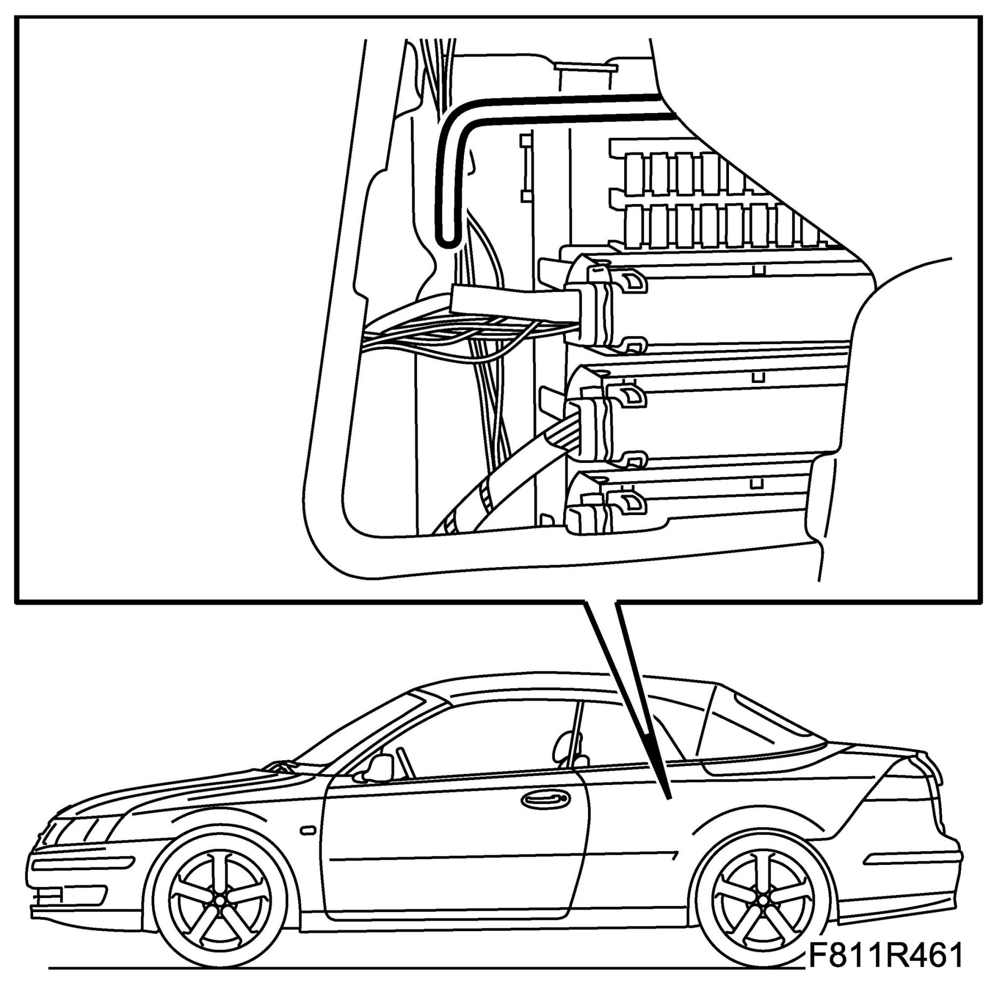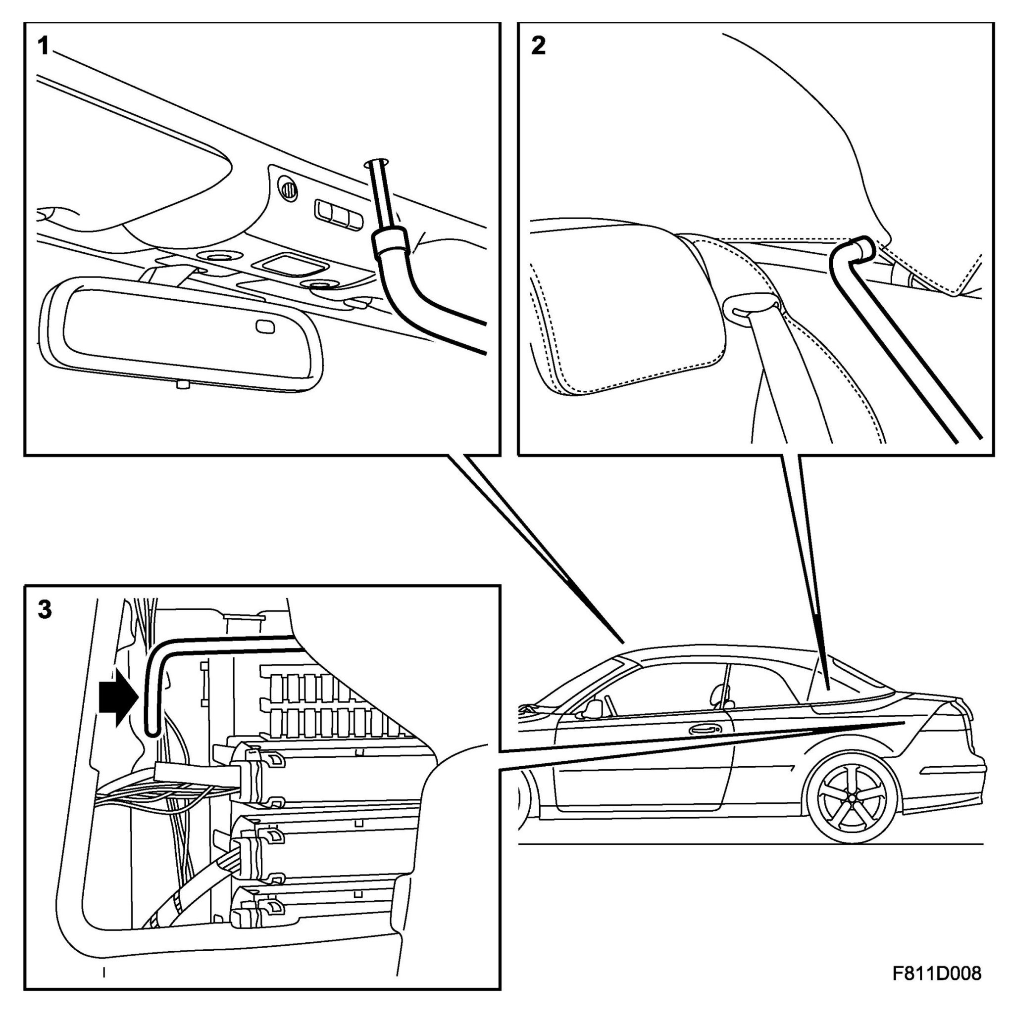 The rods for emergency operation are located to the left and right behind the luggage compartment trim. For access, the cover for changing bulb must first be removed. To unlock the soft top cover, the emergency operation rods must be pushed (3) forward.