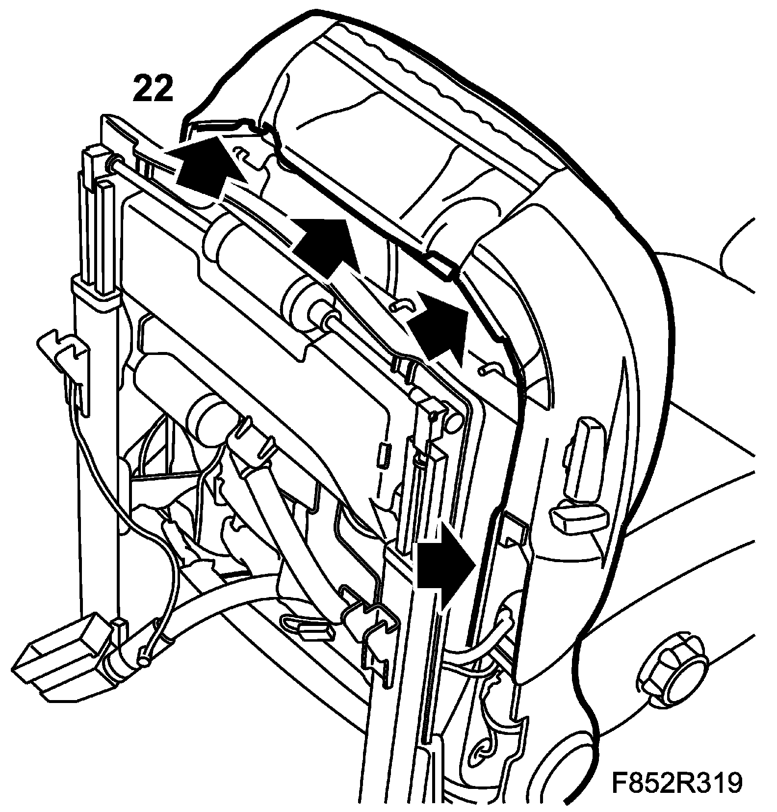 14. Remove the back of the backrest by pressing the back plate towards the top of the backrest at the same time as guiding the plate out from the backrest.