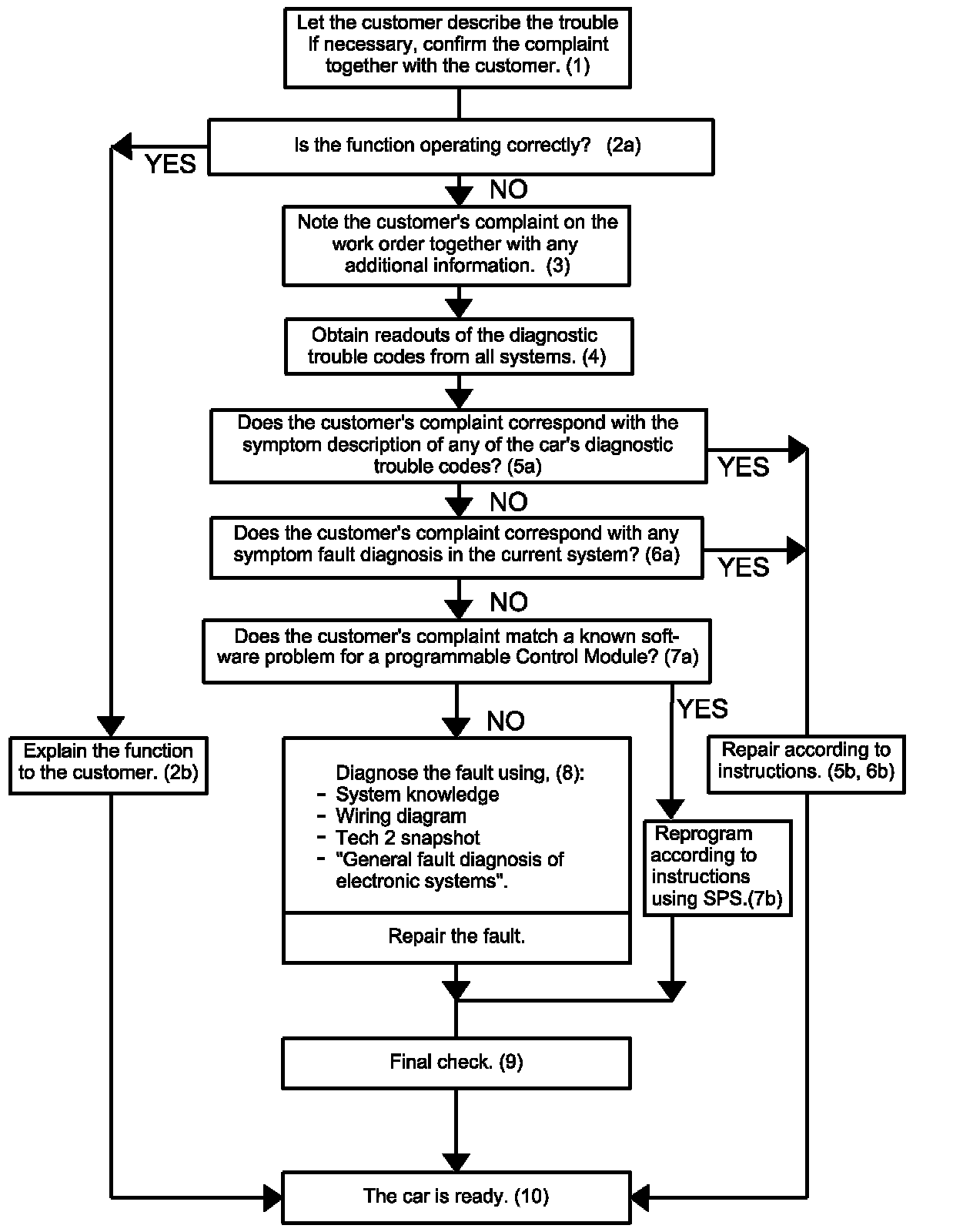 Saab's fault diagnosis strategy assumes that the technician is familiar with the customer's description of the problem. So note the customer's complaint and any other observations on the job sheet.