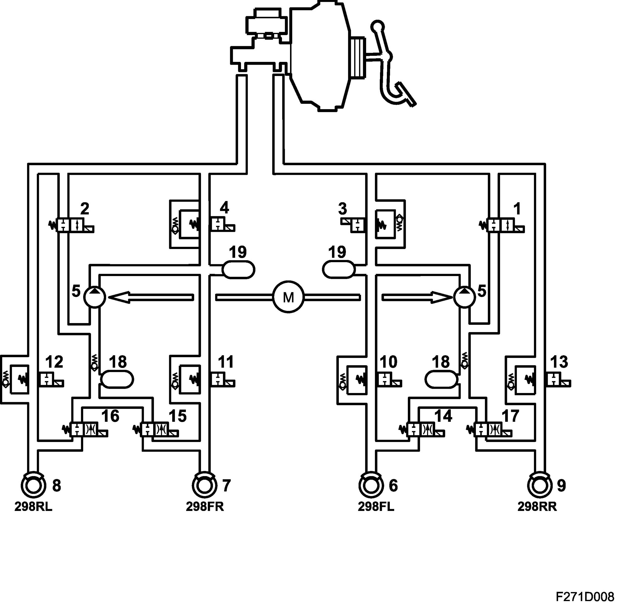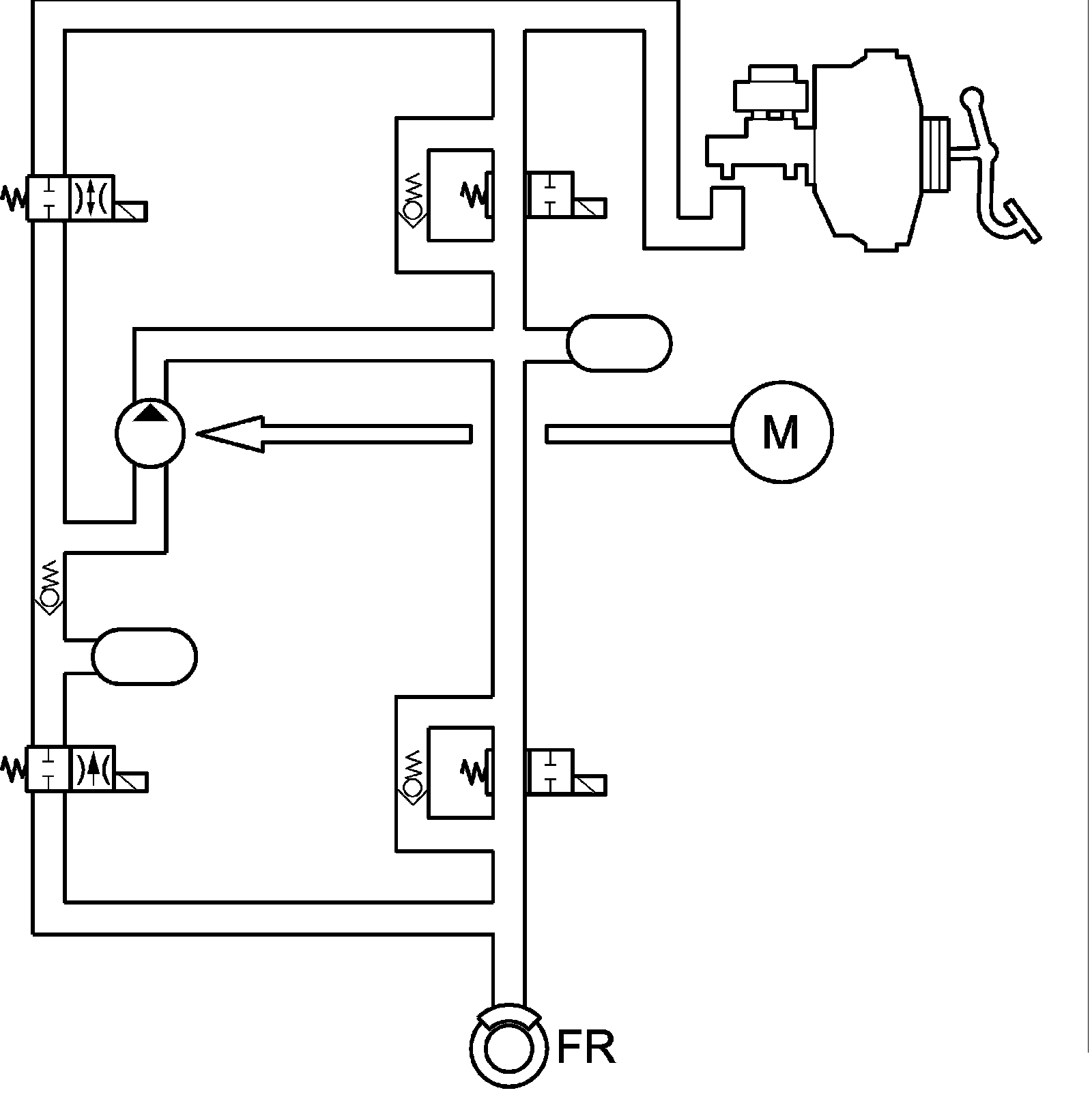Both front and rear wheels are connected to the pressure increase and pressure relief valves in the hydraulic unit, which allows each wheel to be controlled independently.