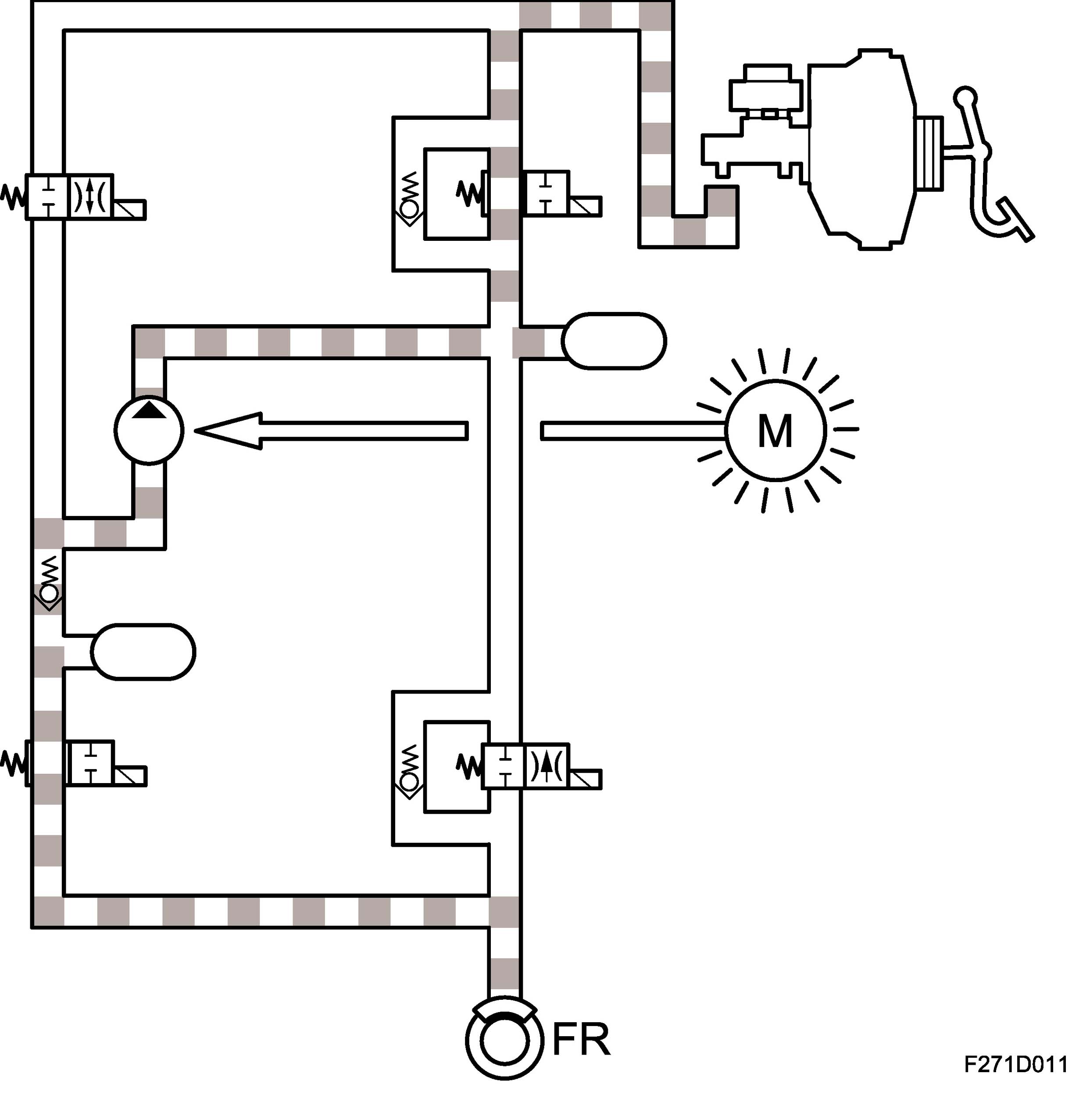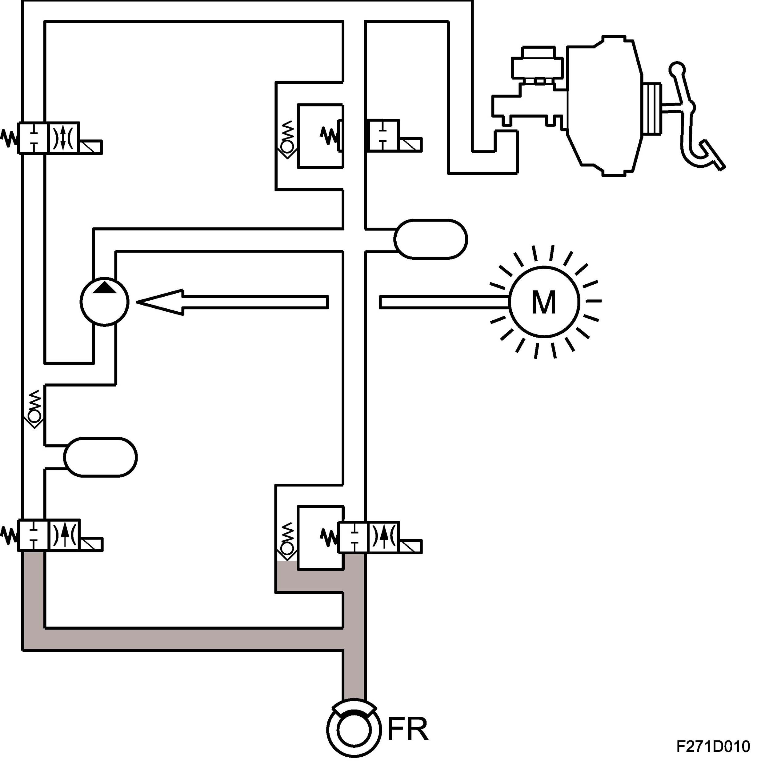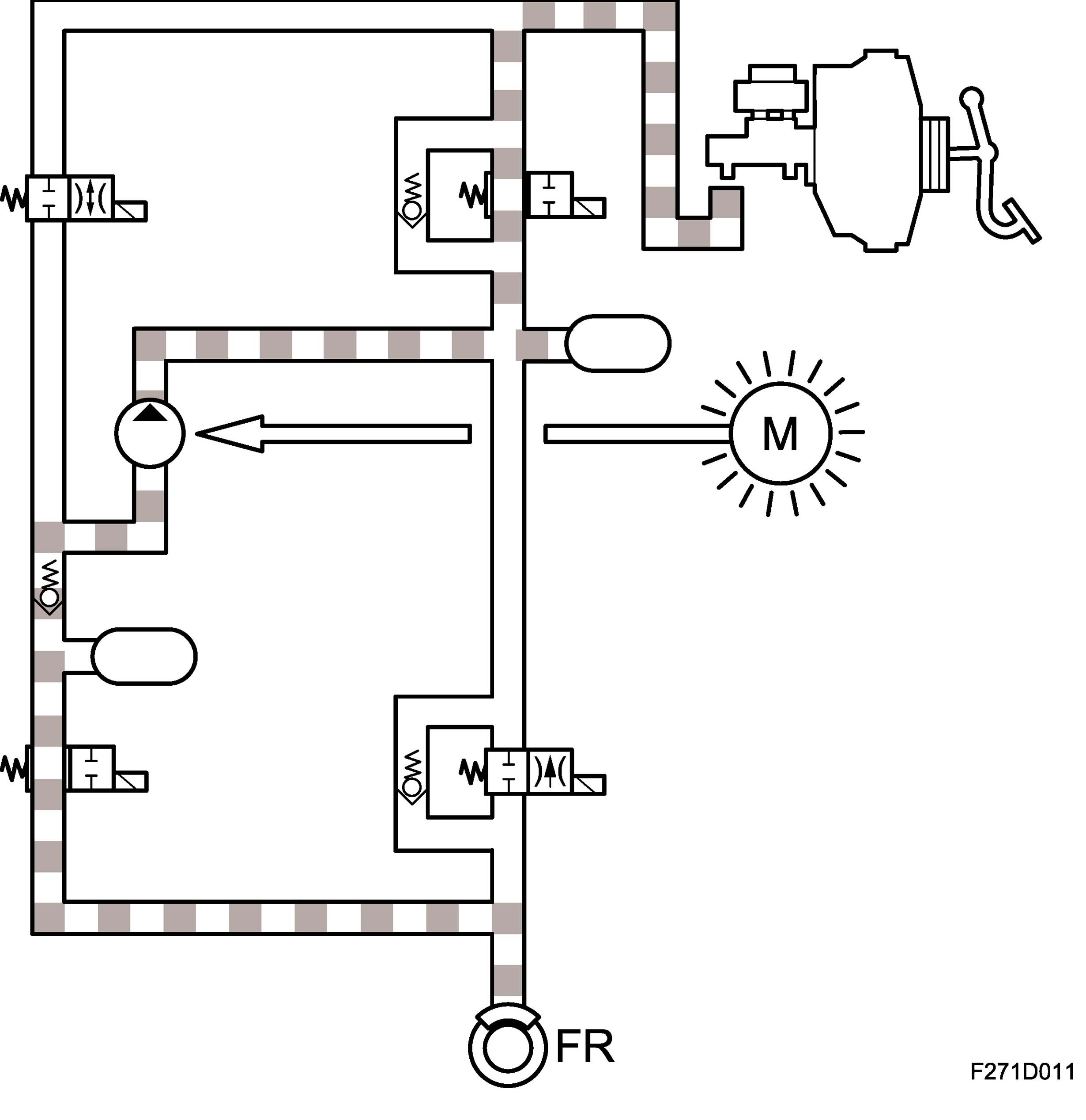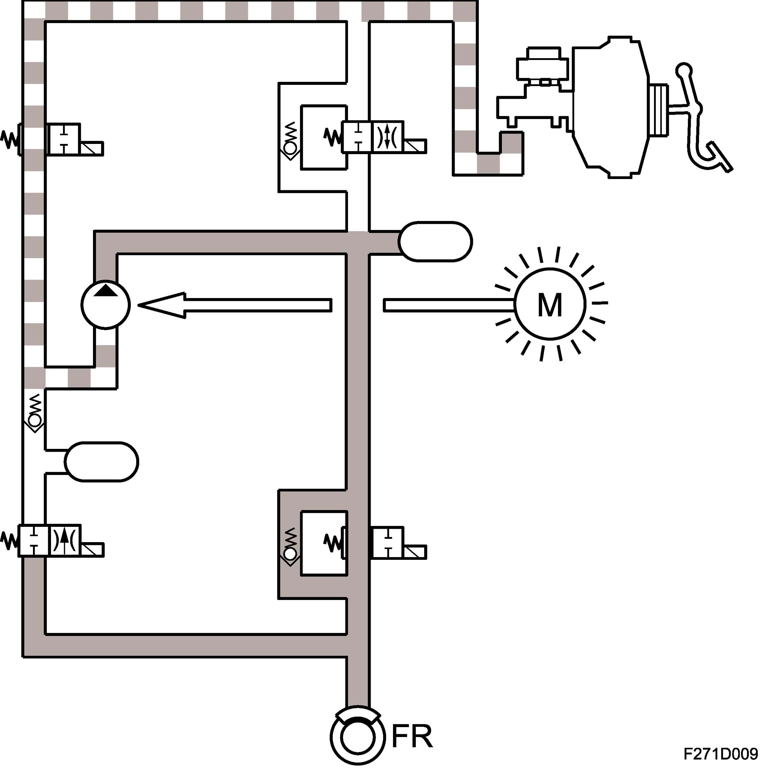 This means that the pressure out to the wheel cylinder is also increased and the wheel is braked. The pump is running.