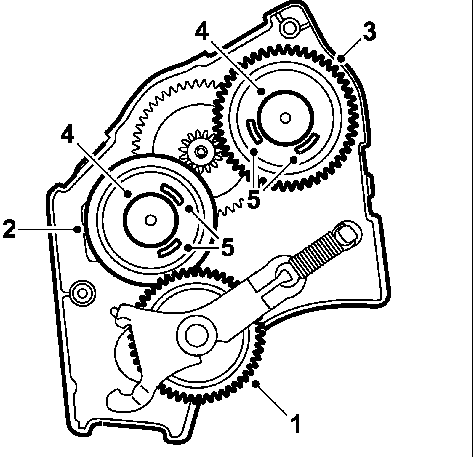 Two of the gears are so-called measuring gears with different numbers of teeth which rotate at different speeds. As a result, their positions change at different times. One gear (2) has 45 teeth (nearest the main gear) and the other (3) has 49 teeth while both have an individual permanent magnet. Two Hall sensors are located by each magnet which register movement in the direction of the magnetic field. The sensors alter their resistance using the direction of the magnetic field registered by the sensors when the gears rotate.