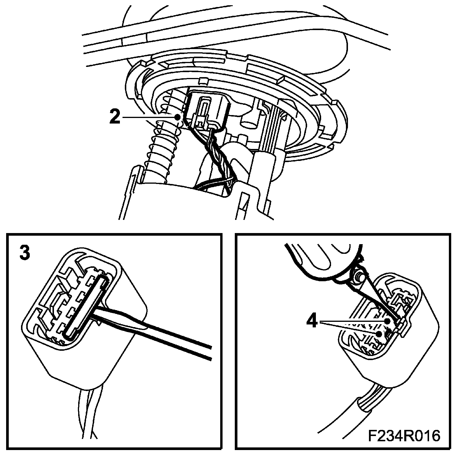 2. Connect the fuel level sensor cables to the connector. Pin no. 2 (grey cable) and pin no. 3 (white cable).