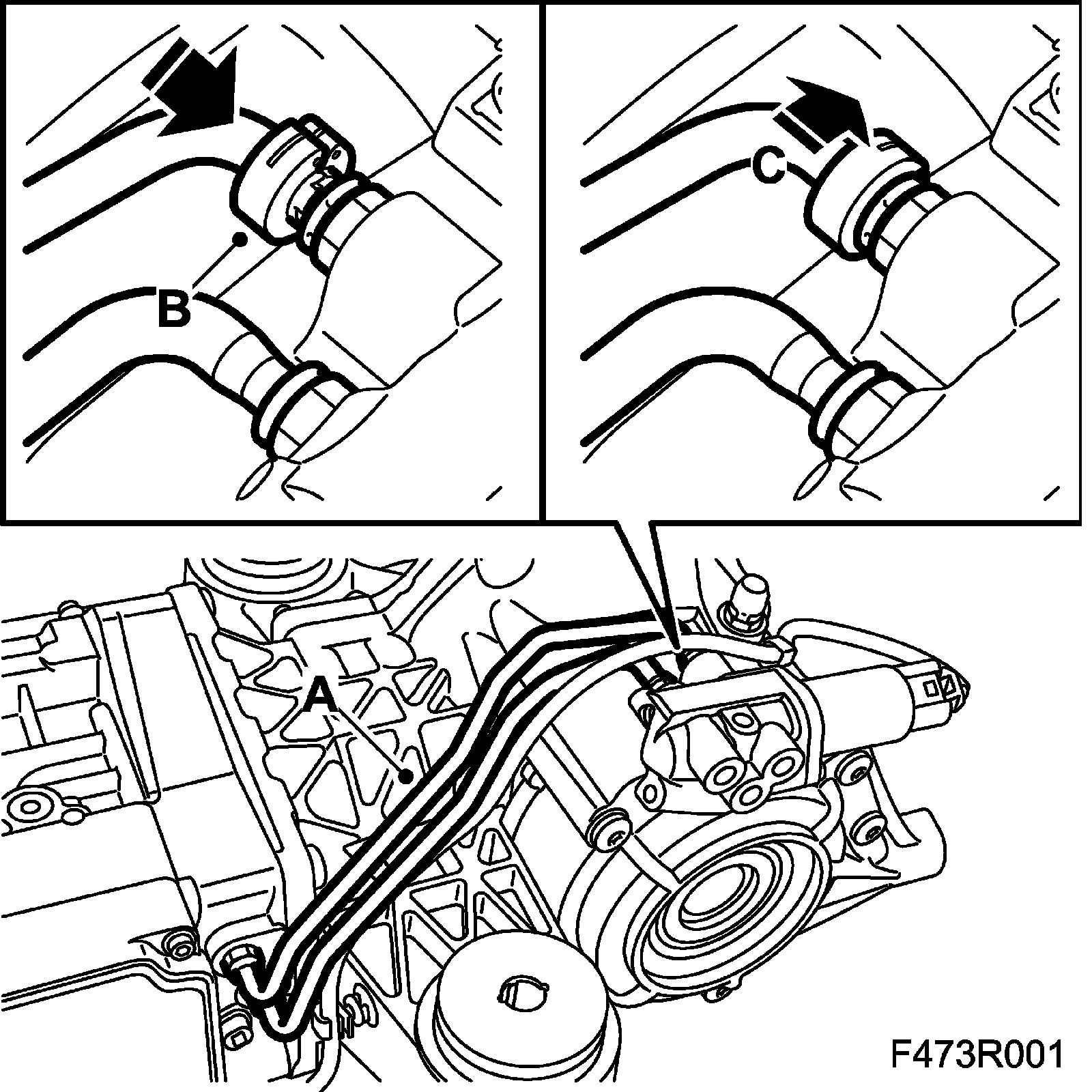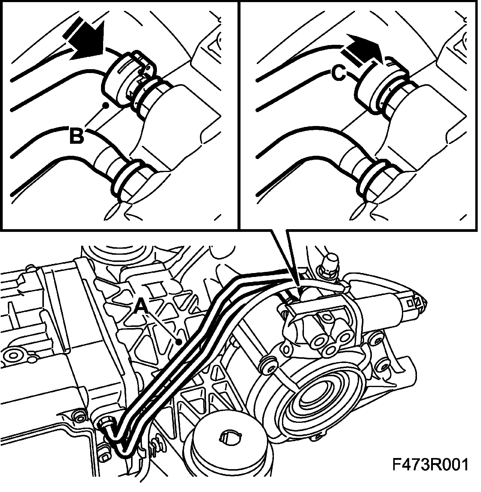 2. Cars with limited slip differential clutch: Remove the hydraulic pipes (A) fit tool DT-49132 (B). Turn the tool (C) slightly and pull the pipe out from the quick-release coupling.