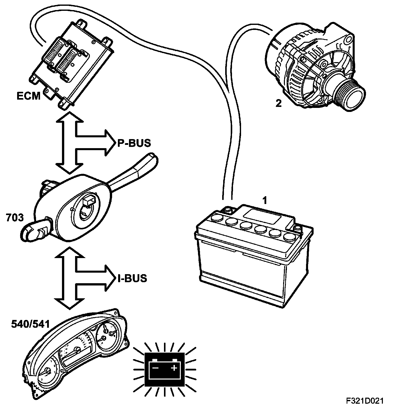 The generator is driven by the engine via a poly-V belt from the crankshaft pulley. The engine control module determines when the generator should begin charging, which takes place when the control module receives a signal that the engine has started. If a charging fault occurs, the generator sends information on this to the engine control module. The engine control module sends the information, via the CIM to the MIU/SID which indicates that charging is not working. A diagnostic trouble code is generated in the engine control module.