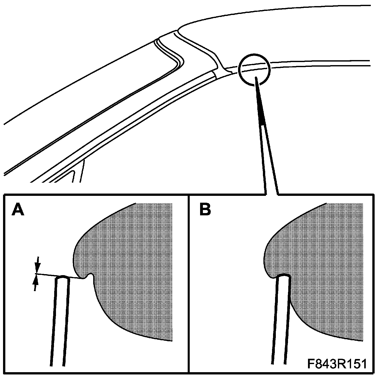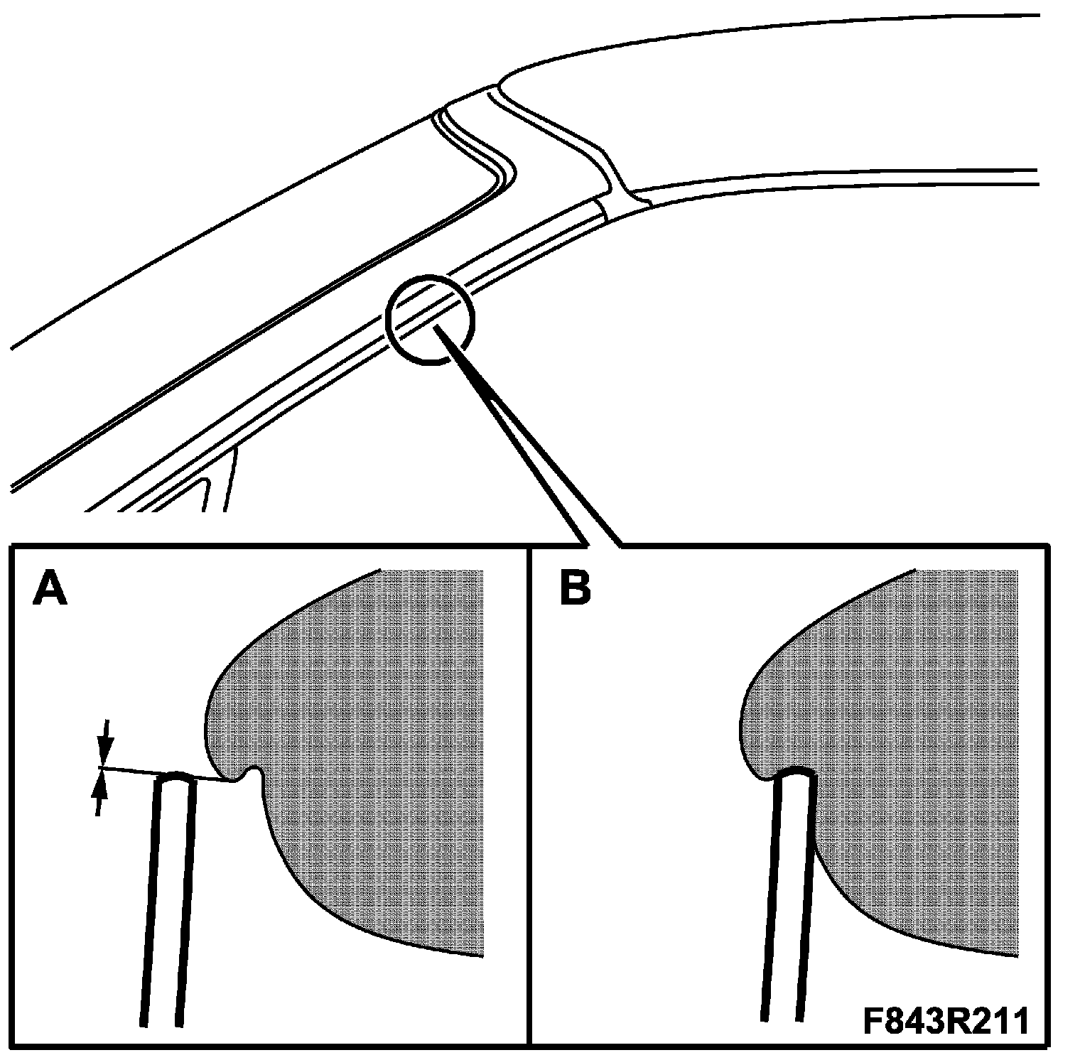 3. The edge of the door window must run precisely and freely against the lip of the seal when the door is closed (A). The window must then lightly touch the lip of the seal if it correctly adjusted for height. When the door is closed the lip of the seal must close around the edge (B).