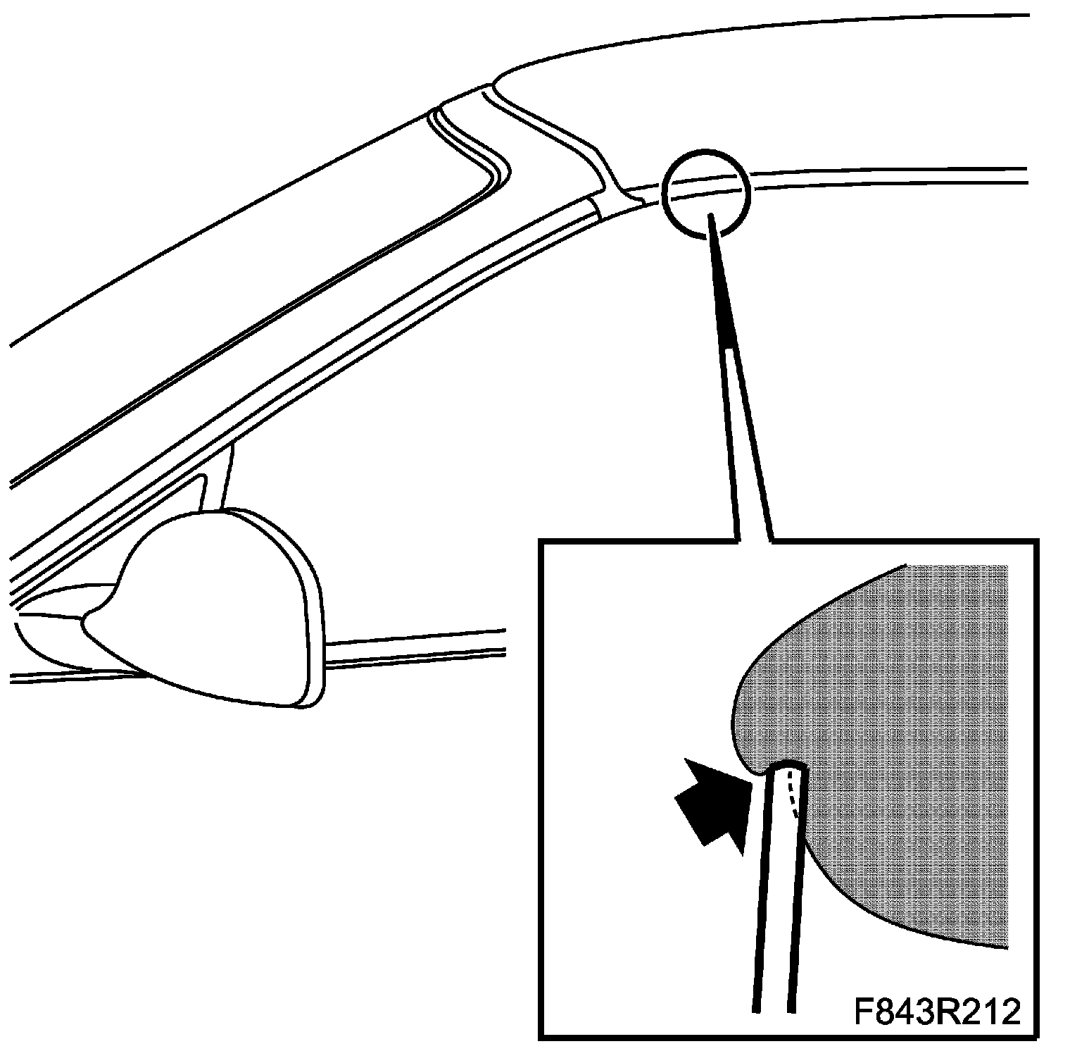 3. Check the door mirror base seal against the edge of the A-pillar trim moulding. The gap should be parallel. The two seals should be in line with each other.