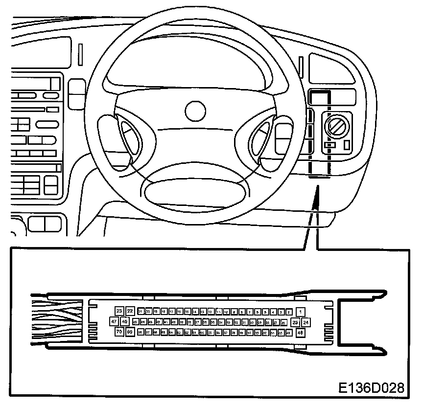 The DICE control module is located above the main relay board (LHD) and adjacent to the main relay board (RHD). It is connected to the system components with a 70 pin connector.