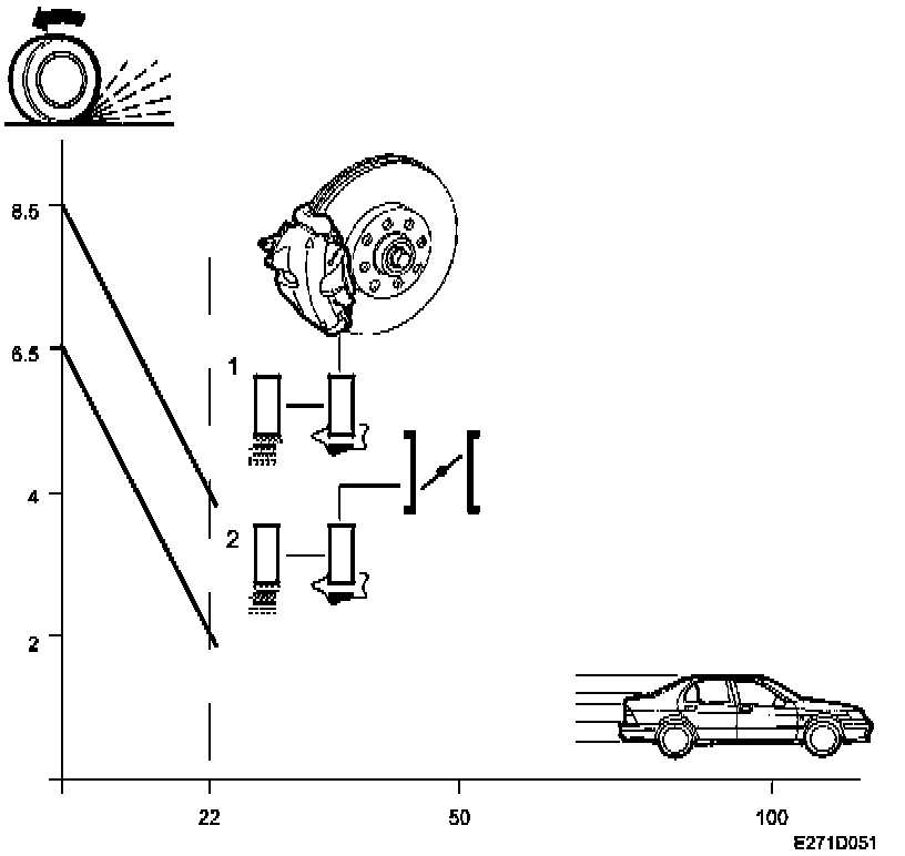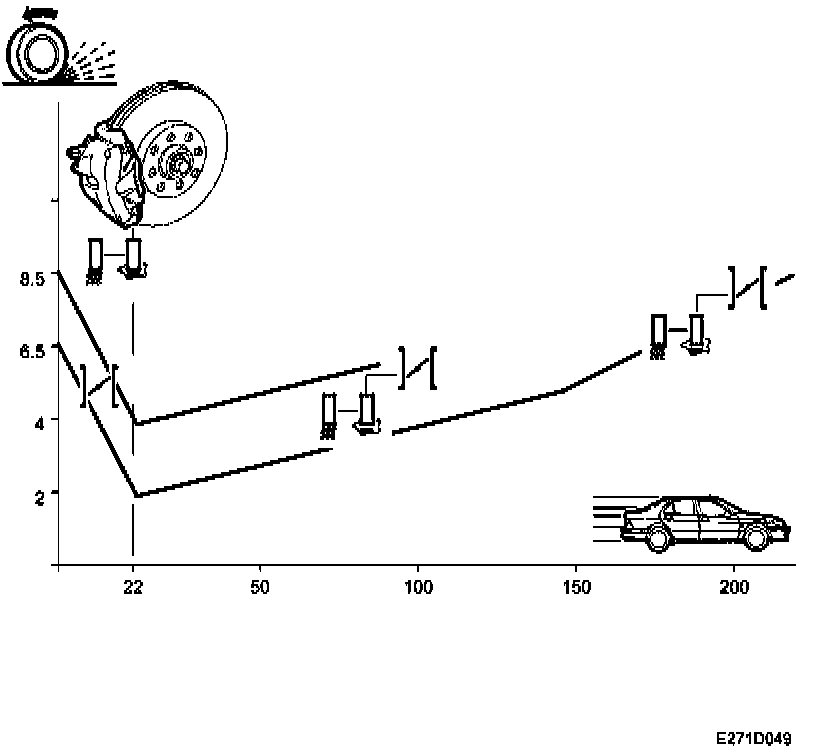 The upper limit for permitted wheel spin before modulation is engaged then gradually drops until a vehicle speed of about 22 km/h (13.5 mph) is attained and then increases again for engine torque limitation and brake application.