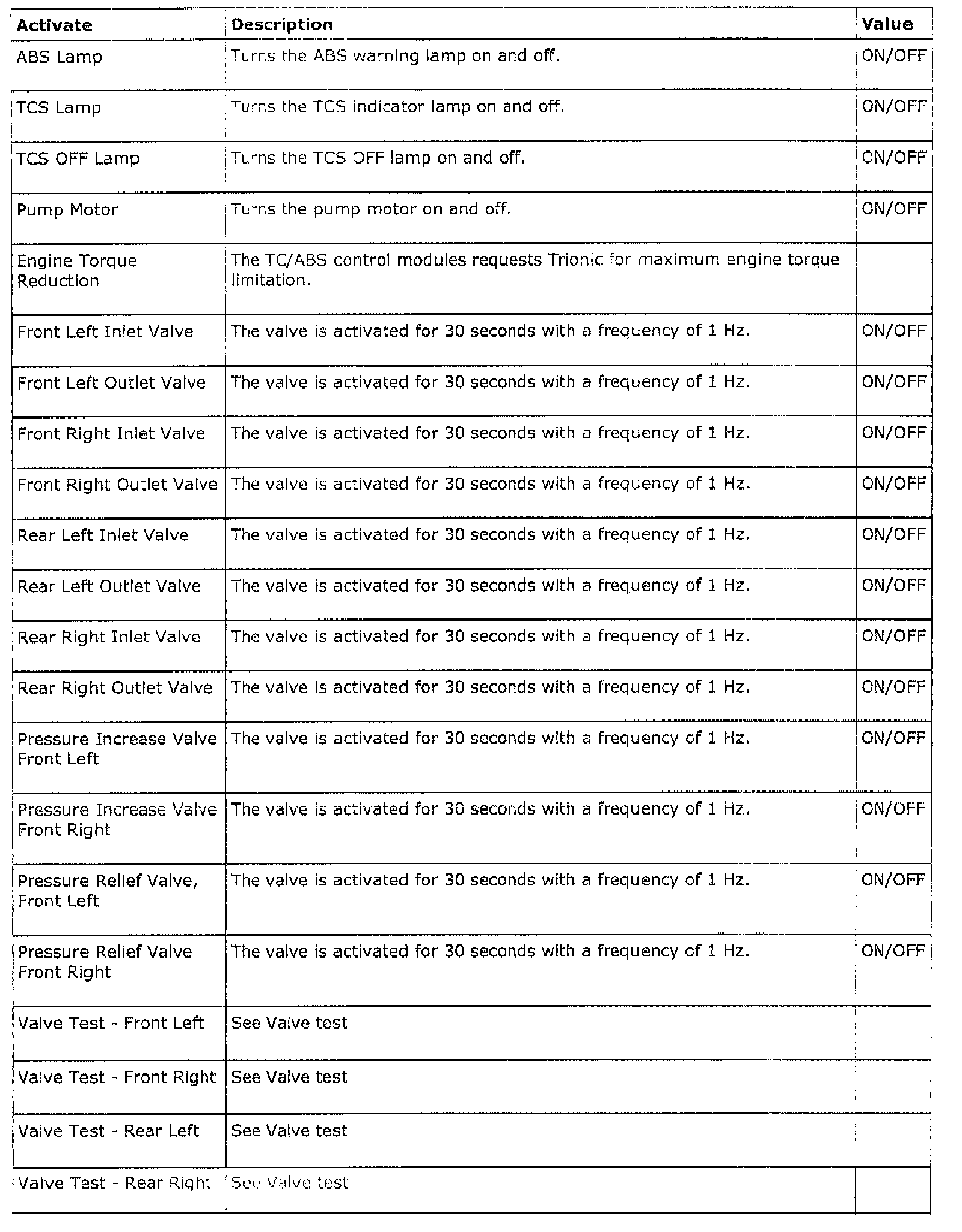 Important: Activate functions should always be used with discretion. Always deactivate an activated function before you go any further in the Tech 2 menu. Always delete any diagnostic trouble codes in the ESP unit or any other system once work is complete.