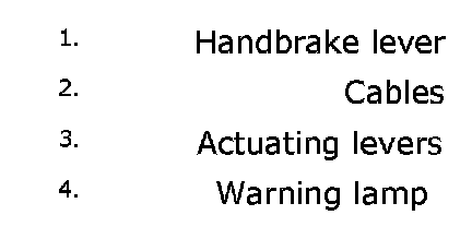 When the Handbrake lever is pulled upwards, the force is applied via two cables (2) to actuating levers (3) on the Handbrake drums on the rear wheels.