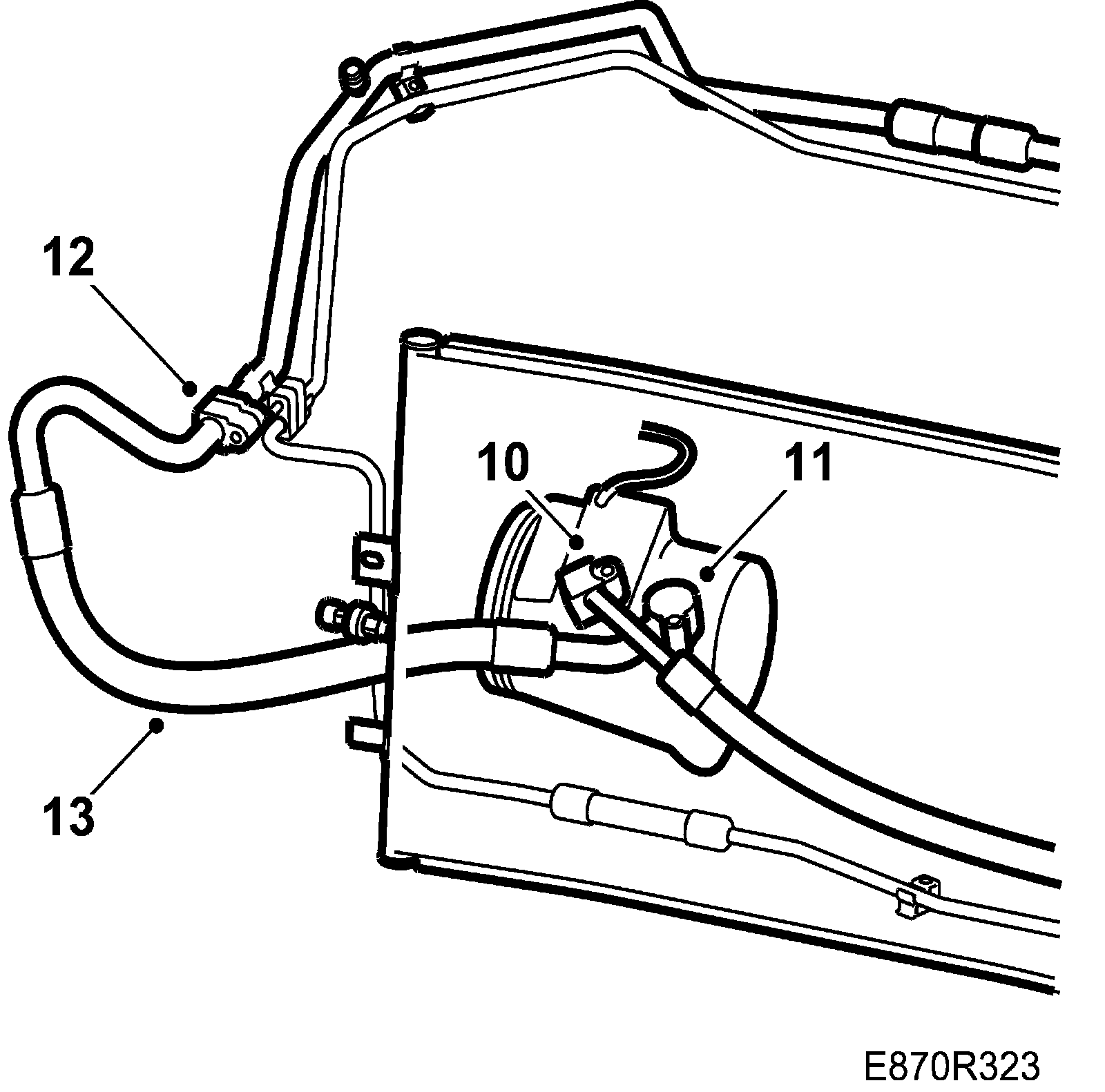 NOTE: Begin by inserting the pipe from the structure out in the right wing in front of the air filter, into the engine bay and up to the compressor above and behind the existing pipes to the inlet for power steering.