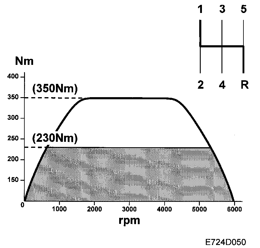 Gear 1 or R is limited to 230 Nm on engine alternative B205E/B235E. Engine torque is limited to 350 Nm in other gears.
