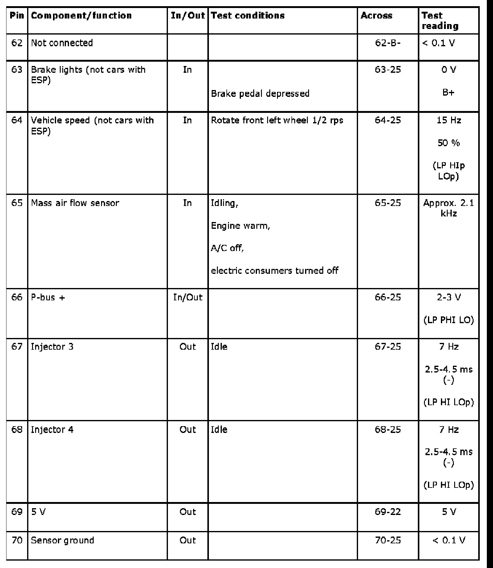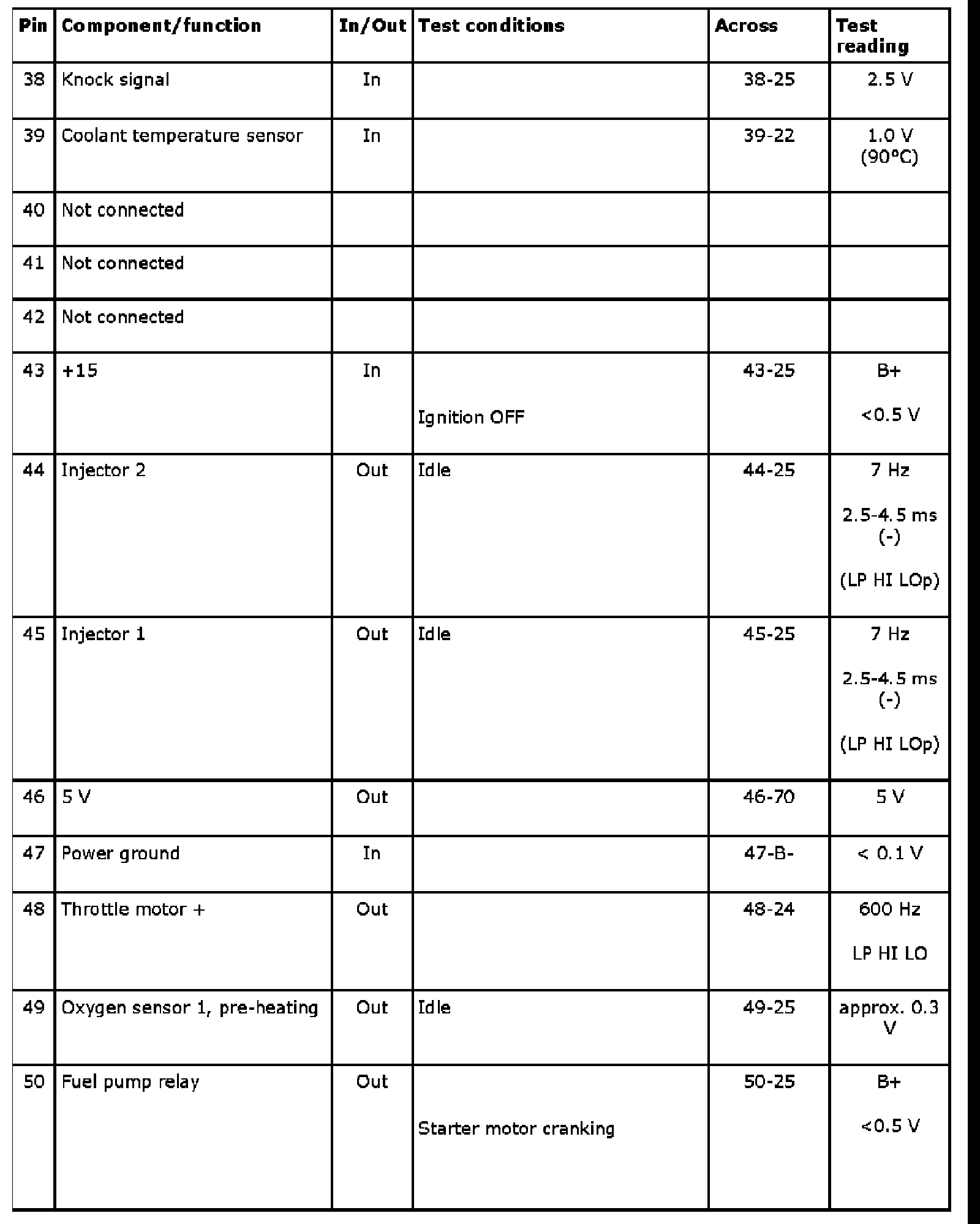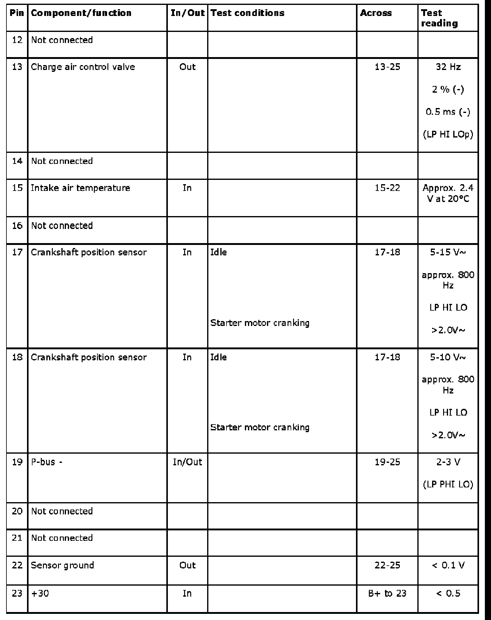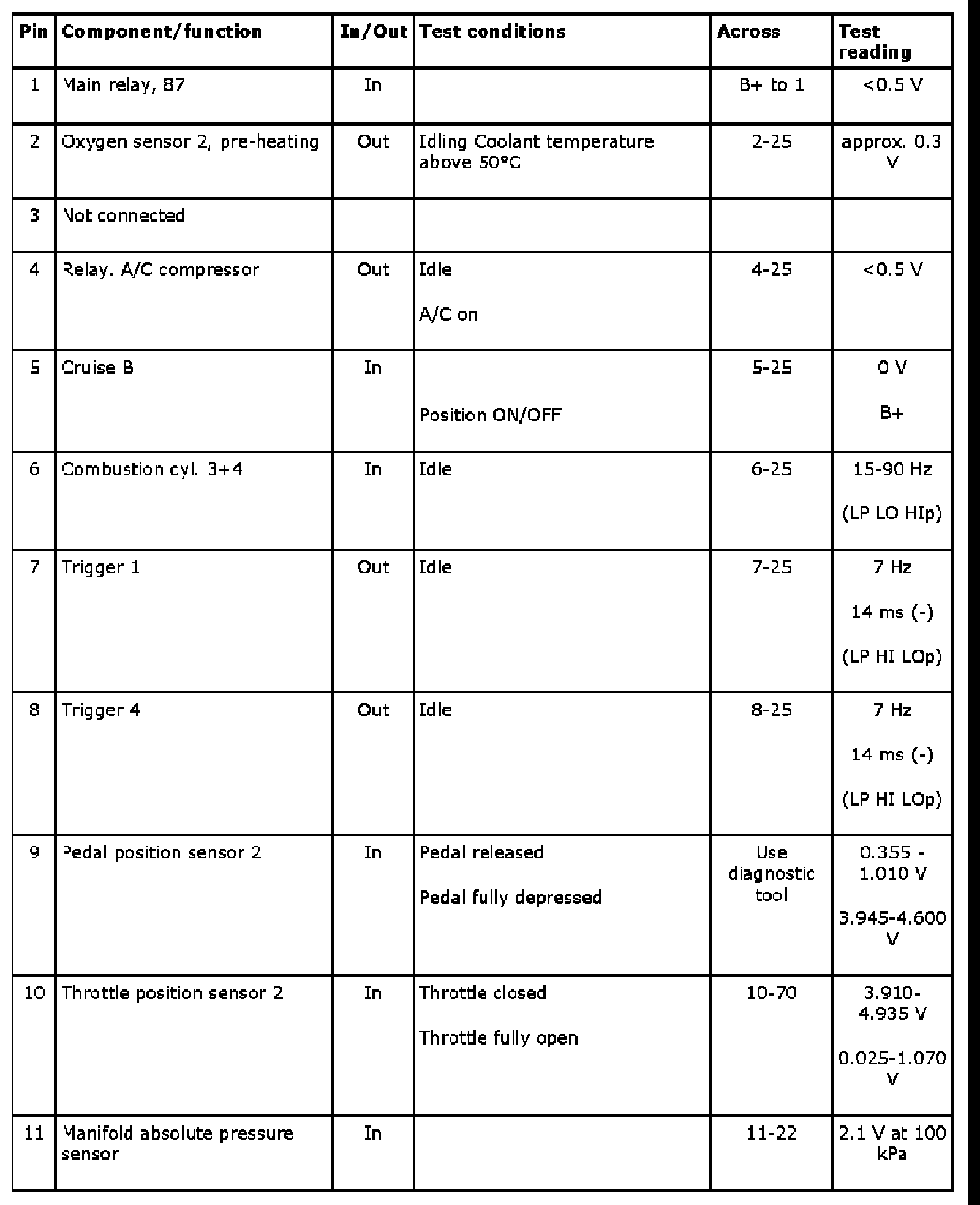 The following tables contain readings and directions for measuring signals and levels on the Trionic control module.