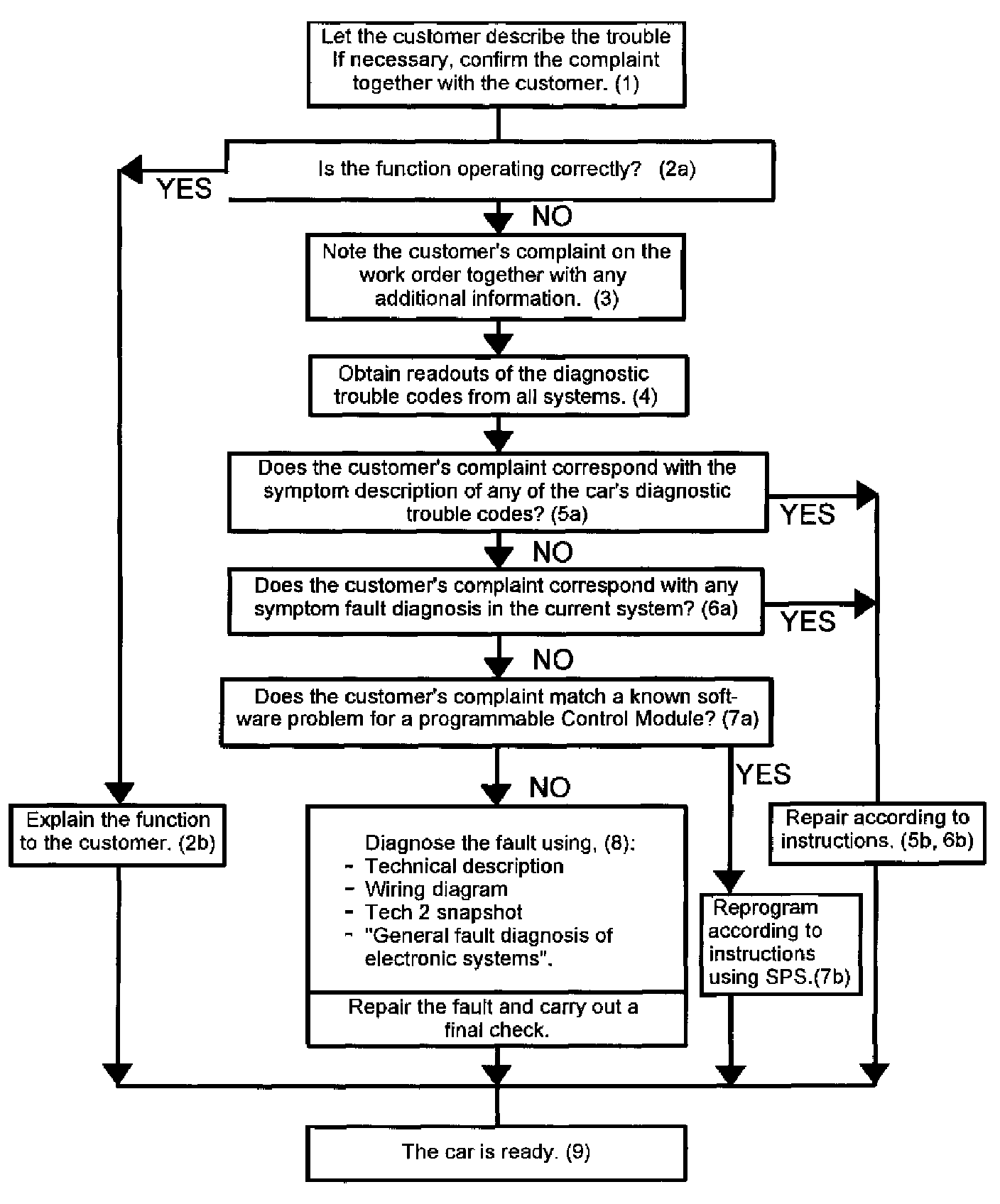Saab's fault diagnosis strategy assumes that the technician is familiar with the customer's description of the problem. So note the customer's complaint and any other observations on the job sheet.