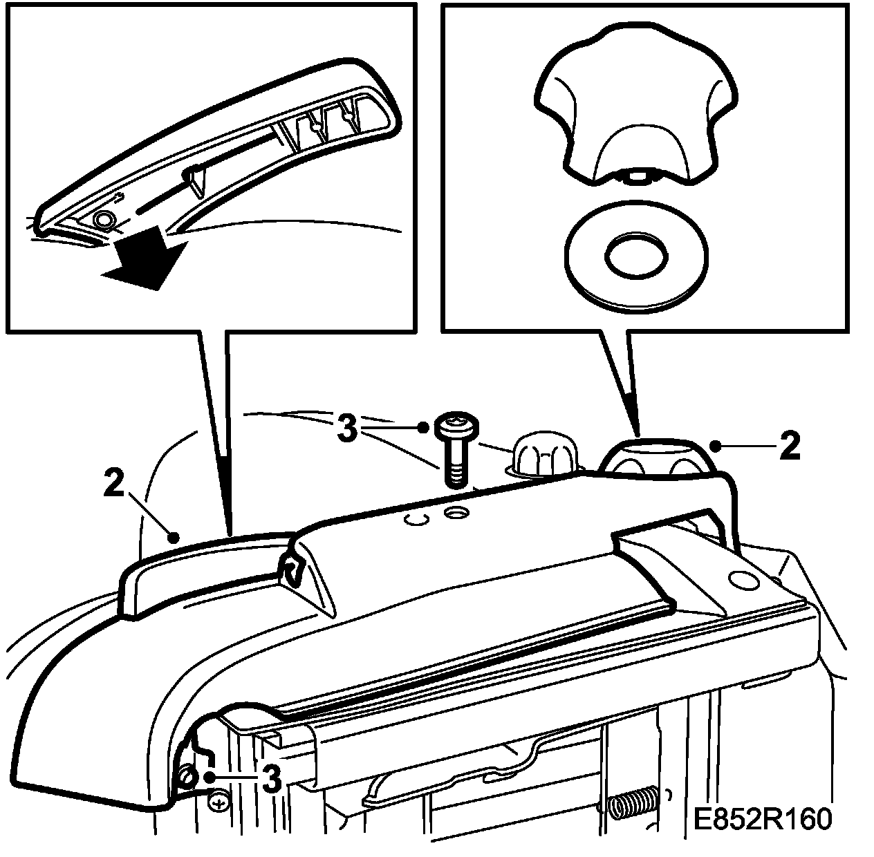 3. Remove the upper seat cowl, 2 covers and 3 screws.