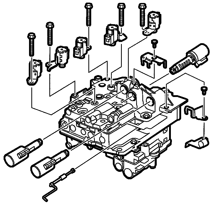 There are 8 solenoid valves on the valve housing. Solenoids S1-S5 are activated when they are energized by the TCM. The solenoids control the gear change valves so that gear changing occurs. The TCM uses information about the input/output speeds of the transmission and the position of the accelerator pedal in order to determine the correct moment at which to change gear.