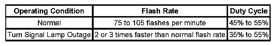 The smart flasher (GMSF), better known as the turn signal/hazard flasher module, is an automotive flasher designed to accept turn, hazard, brake, and daytime running lights (DRL) inputs. The GMSF will provide corresponding outputs to the exterior lamps and instrument panel turn signal indicator lamps. This lighting system has dedicated lamps for the turn/hazard functions and dedicated lamps for the brake function. The system incorporates the use of flash rates for diagnostics. The flash rate is a calculation of the number of flashes that occur within a 60-second period. This system uses a percentage of on-time to off-time called duty cycle. For the bulb outage condition, the indicator of the vehicle side on which the outage occurs shall assume bulb outage flash rate mode. The opposite side indicator will assume the normal flash rate mode for an input from the non-bulb outage side of the vehicle. Hazard warning lamp outage will maintain a normal flash rate as long as 2 or more exterior signaling lamps are functional. During all modes of operation, the instrument panel cluster (IPC) will receive the same flash rates and duty cycles that the exterior lamps receive. The IPC will then control the indicators in the cluster. The vehicle operator will be provided with an audible and visual indication of the flasher operation. Below is a table with flash rates and duty cycles: