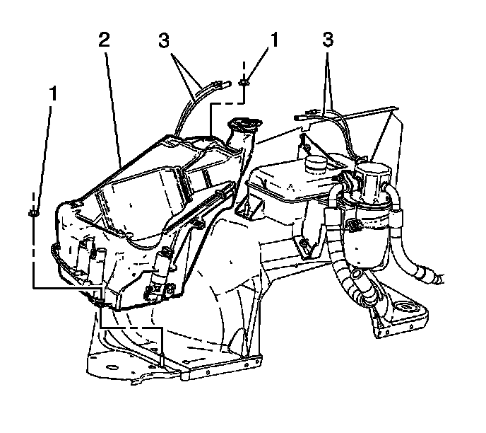1. Install the lower air filter housing/washer solvent tank assembly (2) onto the mounting studs.