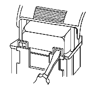3. Locate the dress cover locking tabs at the front of the connector. Using a small flat-blade tool push down on one of the locking tabs and pull the cover up until the dress cover releases. Repeat this procedure for the other locking tab.