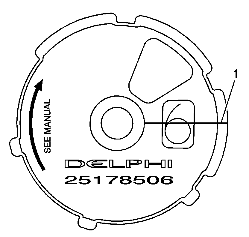2. To perform an on-vehicle test, scribe or draw a line (1) on the camshaft position actuator, flush with the head, in the full advanced position. See arrow on the camshaft position actuator. With the engine at TDC on #1 cylinder, the wording should be level.