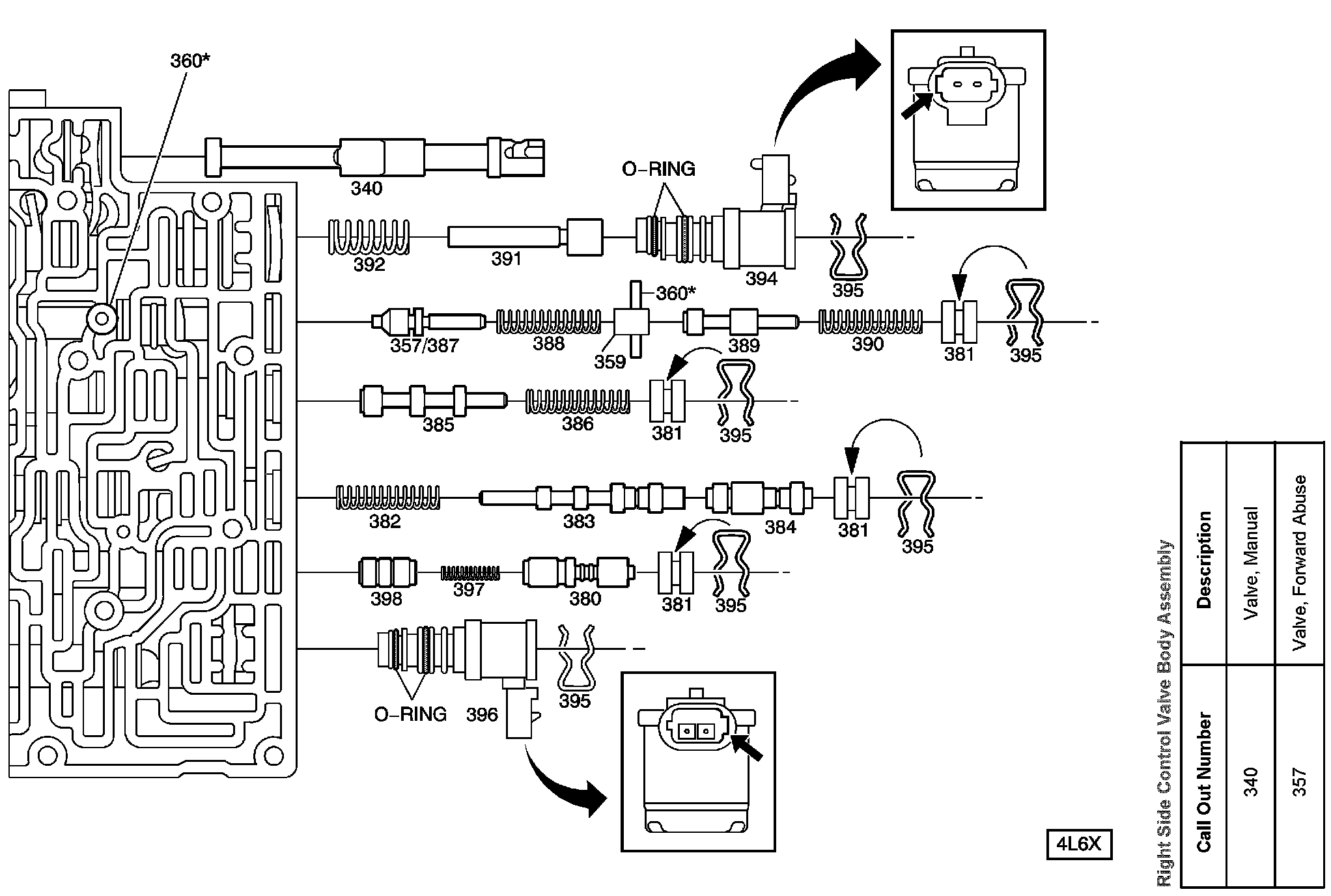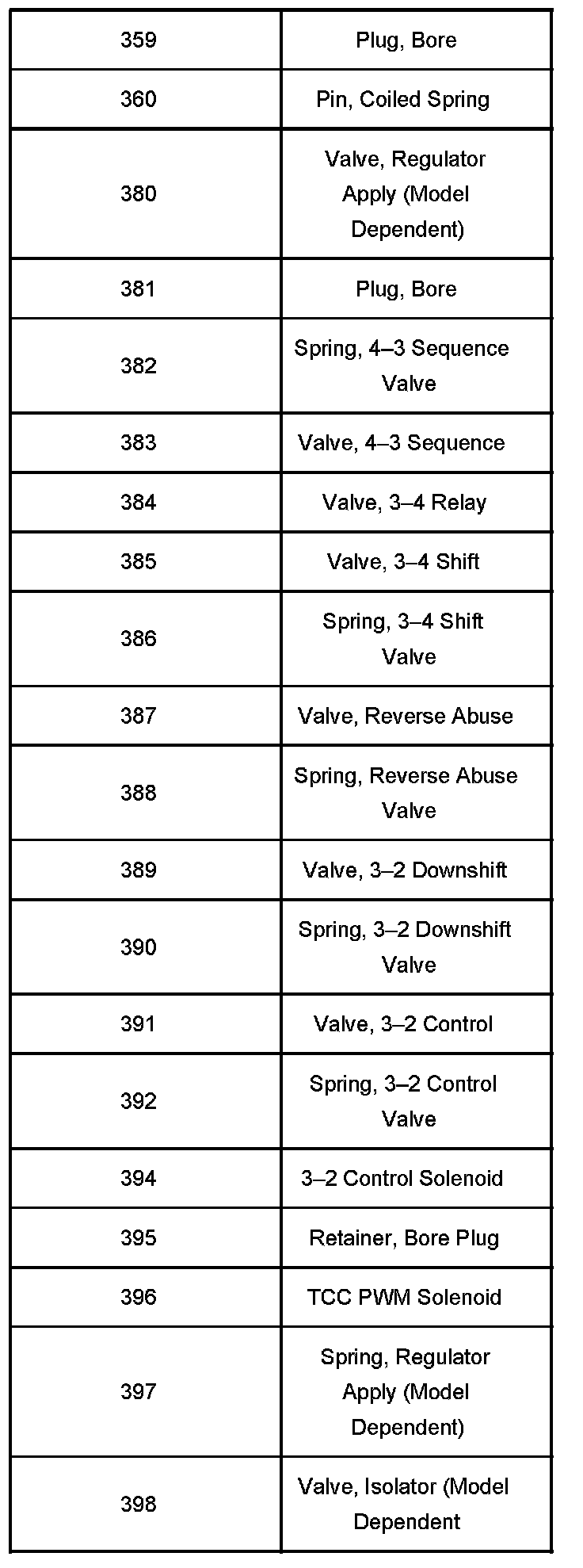 If the valve body has been contaminated with debris from another transmission component failure, then disassemble all bores for complete cleaning of all valve body components. If possible, keep individual bore parts separated for ease of reassembly. Use the illustrations in this bulletin for a positive identification and location of individual parts: