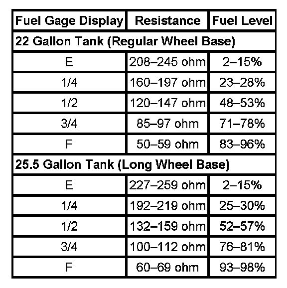 The information in this table is intended for use with the J 33431-C Signal Generator and Instrument Panel Tester. The fuel level sensor values represent the test values to be used on the Signal Generator to drive the fuel gage display to the indicated positions. Vehicles that require more than one fuel level sensor calculate gage position from many possible resistance combinations of fuel levels between the two tanks. Therefore, the values in the table may not correlate directly to readings taken from the vehicle primary or secondary sending units.